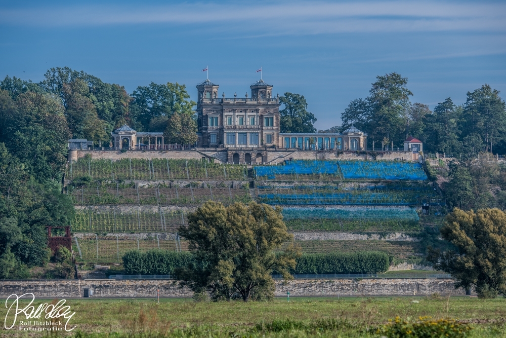 Nächster Punkt: Wie ist wo das Wetter? Berlin grau, Dresden und Umgebung blauer Himmel. Also zockelten wir erstmal am Käthe-Kollwitz-Ufer entlang und besichtigten die Elbschlösser aus der Ferne.