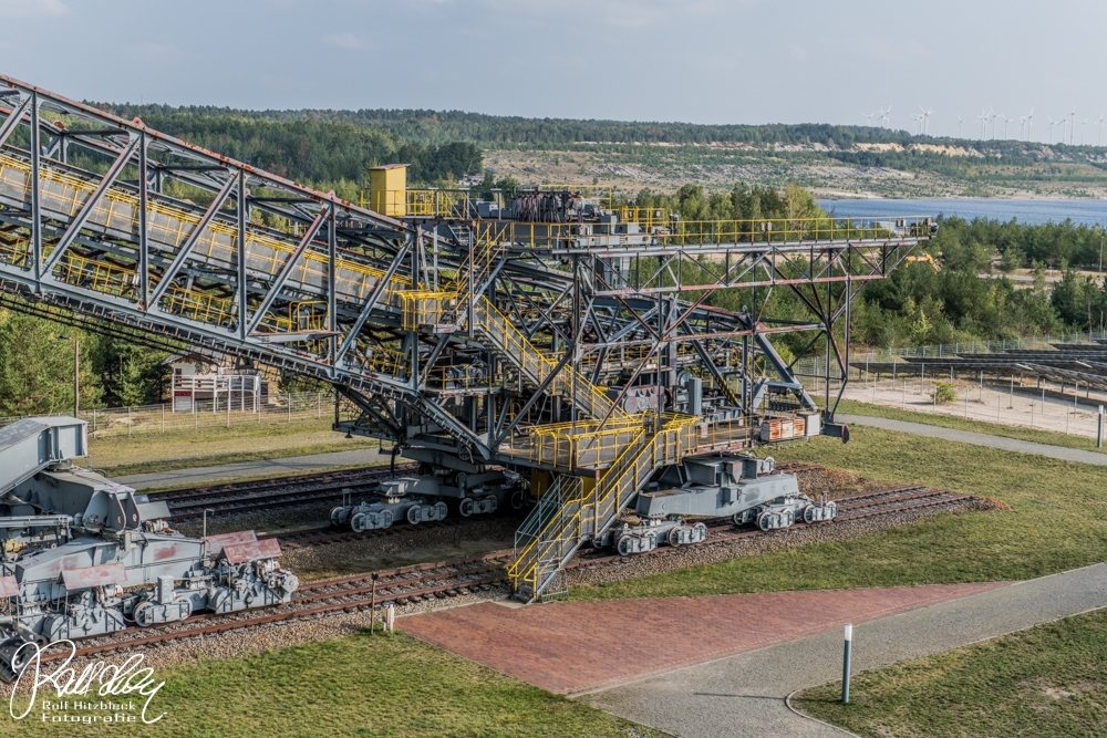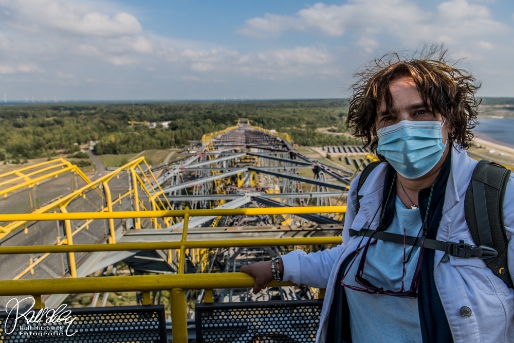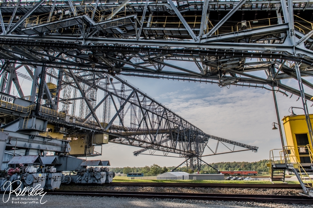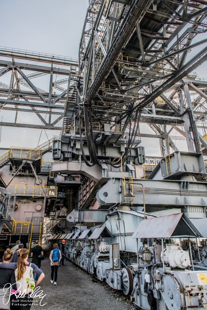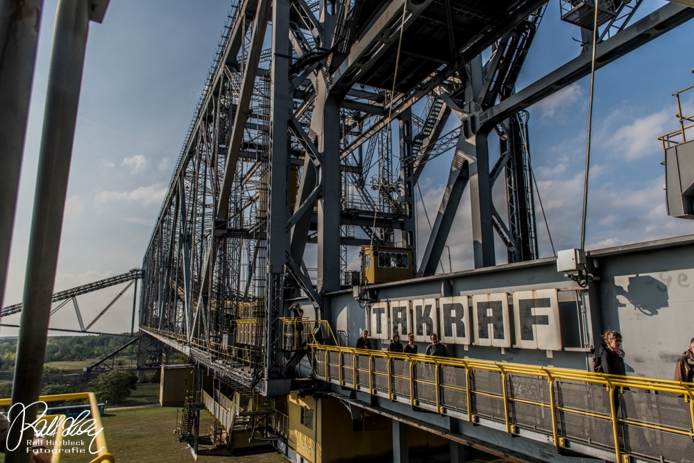 Während des Vortrages erfuhren wir auch, dass ich mit meiner Bezeichnung „Braunkohlebagger“ total falsch lag. Dieses Riesengerät (Länge über 500m) dient NICHT dazu, irgendwelche Braunkohle zu fördern oder befördern. Es handelt sich bei der F60 (es gibt noch drei weitere, die noch aktiv sind) um eine Abraumförderbrücke, die nur dazu dient, die Erde ÜBER der Braunkohle abzutransportieren, damit die Braunkohlebagger selbst die eigentliche Förderung übernehmen. Auf der einen Seite wird die Erde mit Schaufeln abgekratzt und am anderen Ende der Brücke auf große Haufen geworfen.