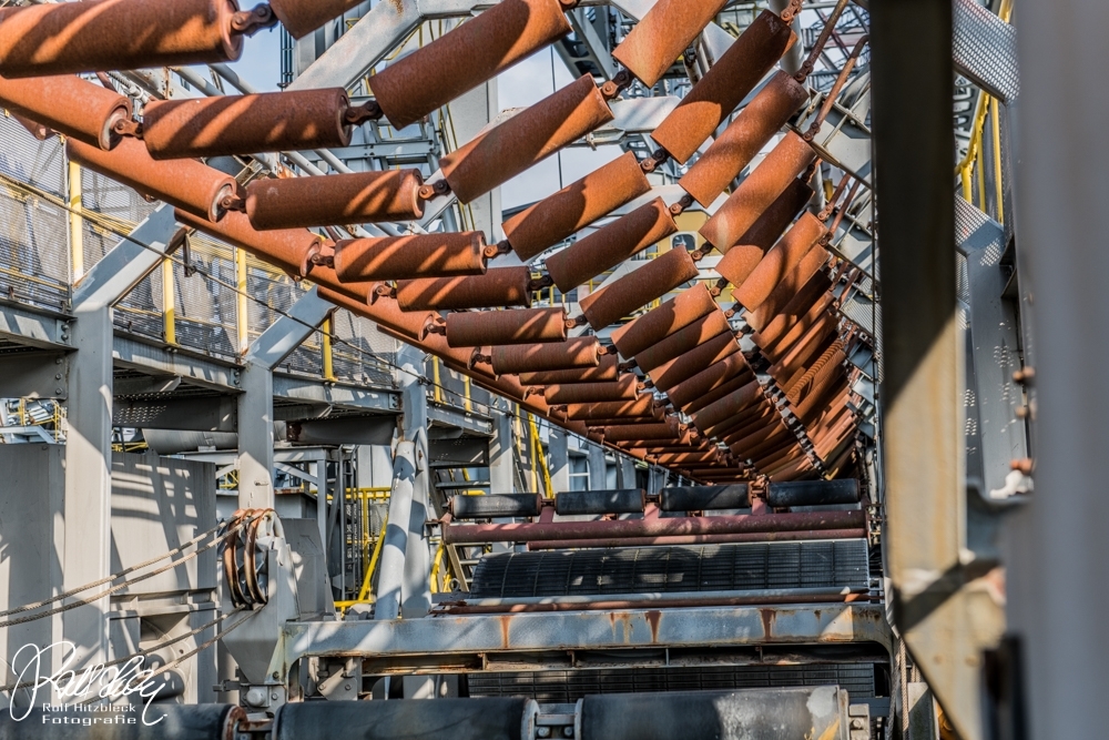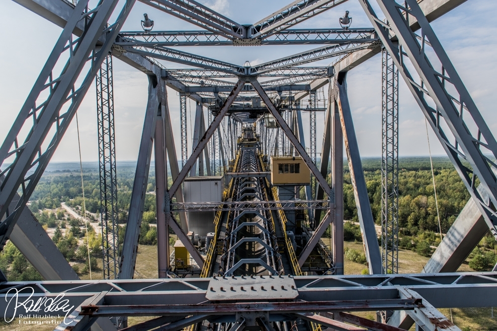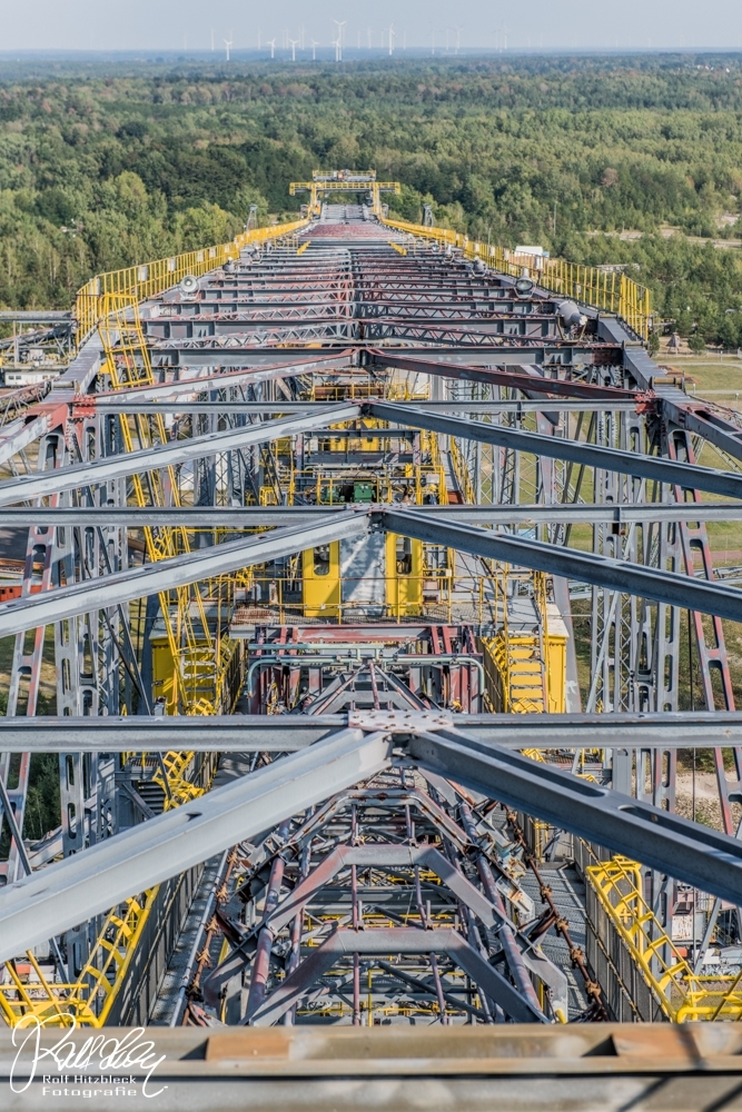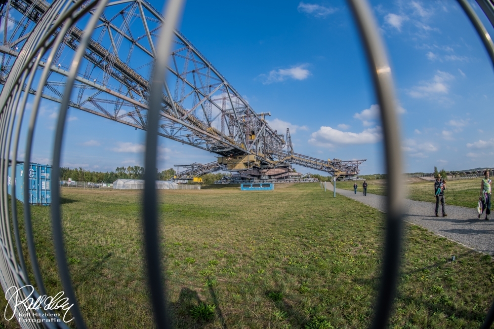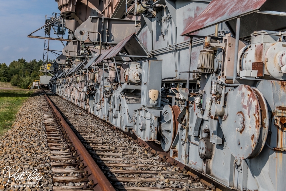 Während des Vortrages erfuhren wir auch, dass ich mit meiner Bezeichnung „Braunkohlebagger“ total falsch lag. Dieses Riesengerät (Länge über 500m) dient NICHT dazu, irgendwelche Braunkohle zu fördern oder befördern. Es handelt sich bei der F60 (es gibt noch drei weitere, die noch aktiv sind) um eine Abraumförderbrücke, die nur dazu dient, die Erde ÜBER der Braunkohle abzutransportieren, damit die Braunkohlebagger selbst die eigentliche Förderung übernehmen. Auf der einen Seite wird die Erde mit Schaufeln abgekratzt und am anderen Ende der Brücke auf große Haufen geworfen.