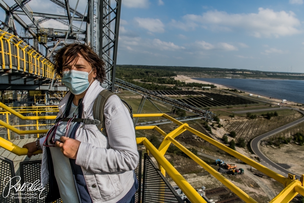 Jedenfalls zeigte ein Schild „Besucherbergwerk F60“ an. F60 erinnerte mich entfernt an einen Ford F150, den ich später mal fahren möchte. Wir bogen ab und ca. eine Viertelstunde später sahen wir einen riesigen Tagebaubagger (wie ich glaubte) aus dem Wald auftauchen. An der Kasse gab es zwei Möglichkeiten: Normaler Eintritt oder mit Führung. Ich watschelte zur besten Höhenkletterin von allen zurück und erläuterte ihr die Optionen. Bevor sie wusste, was sie tat, hatte sie der Führung zugestimmt. Und die nächste Führung begann in fünf Minuten. Passt ja perfekt.