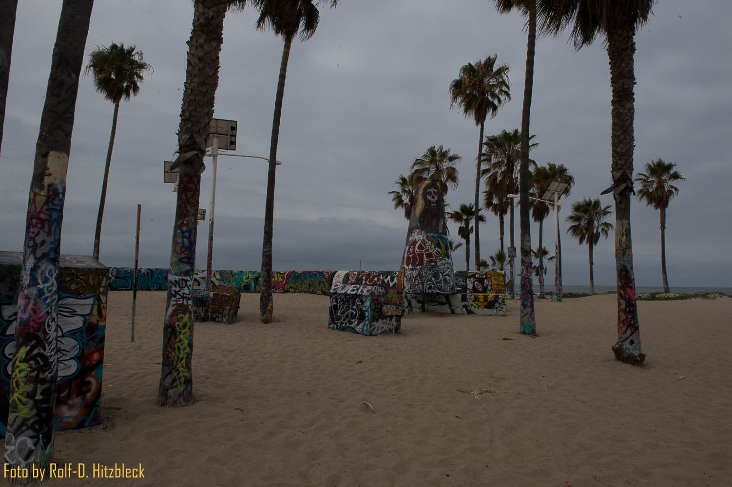 auch der Strand und die Palmen sind gleich, aber es fehlt um die Zeit der sommerliche California-Spirit, die „Hufeisen-Verbieger“ am Muscle Beach, der rollschuhfahrende Gitarrenspieler und natürlich die offenen Läden.