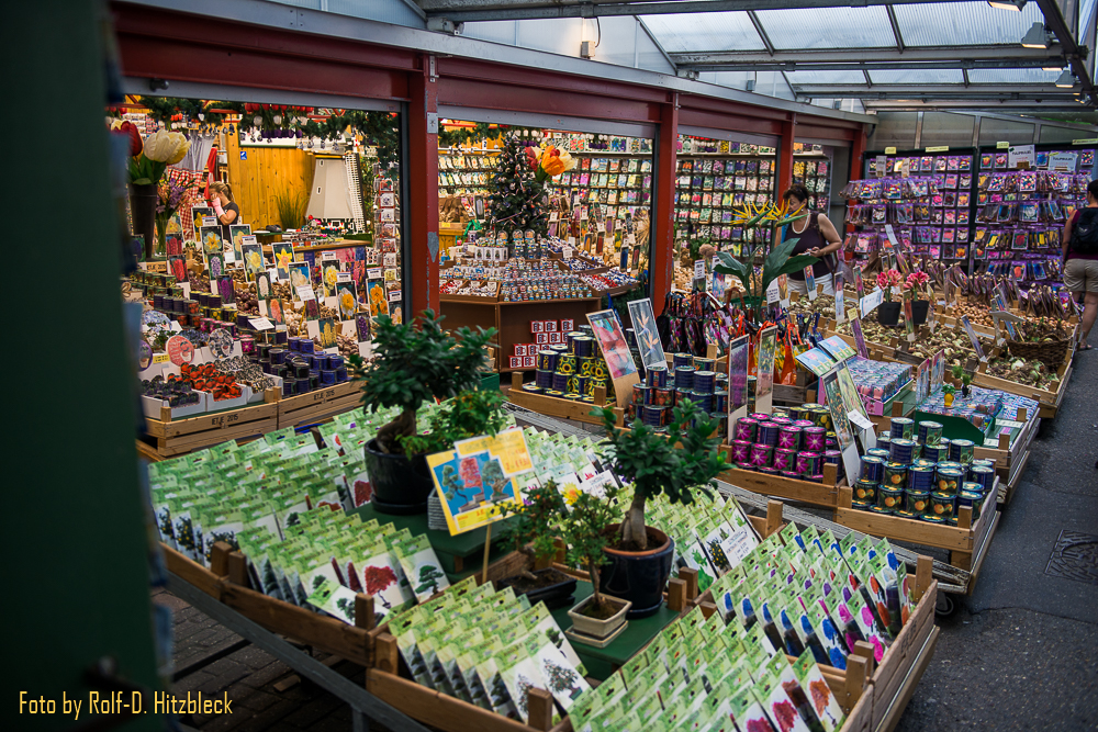 aber wir wollen weiter, wieder ans Wasser. Und an den nächsten Grachten liegt der Bloemenmarkt, der zwar neben dem üblichen Touristenramsch auch Blumennahe Artikel anbietet, aber wenig frische Blumen selbst.