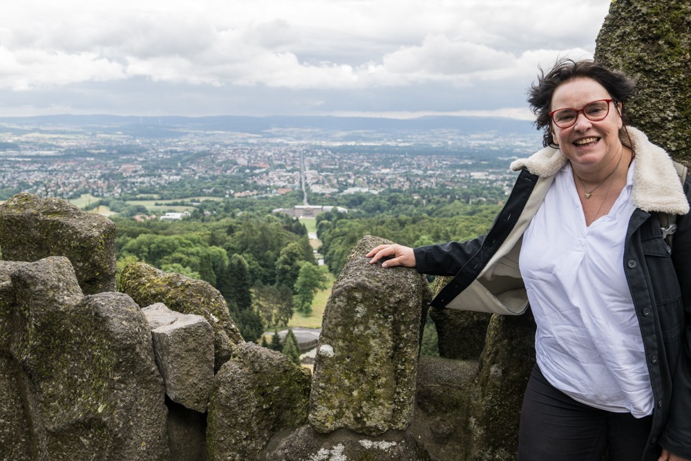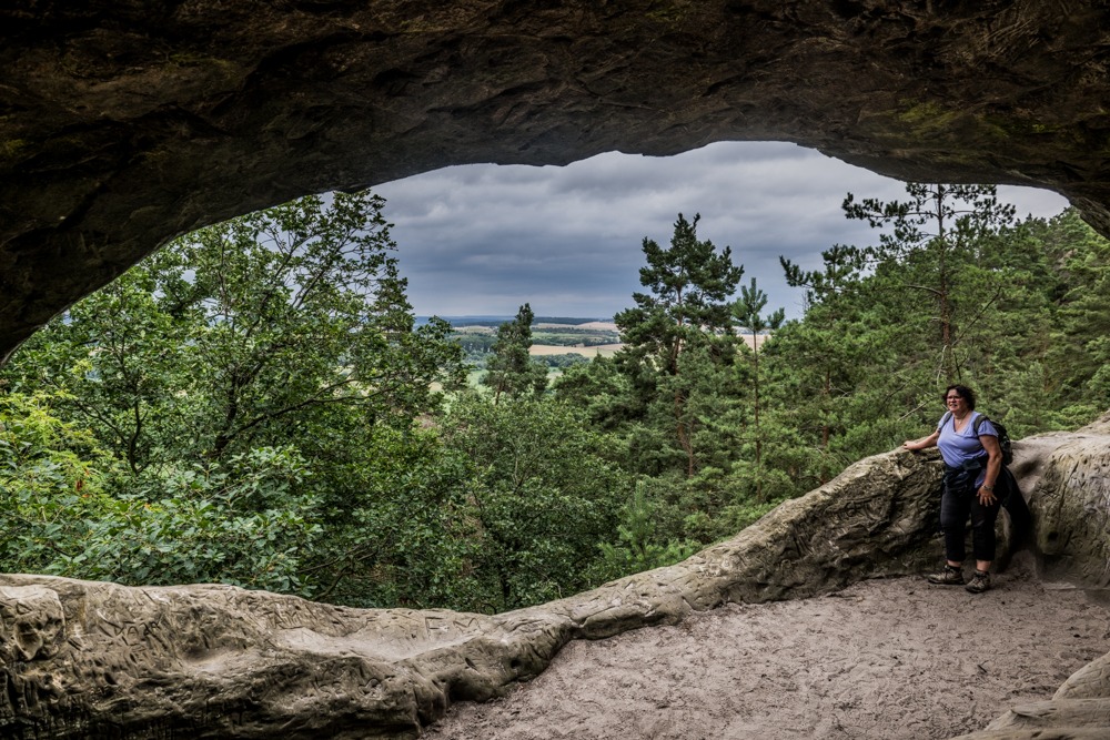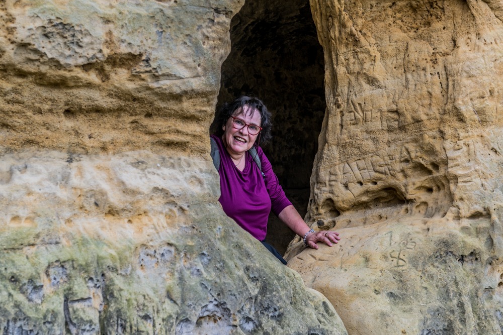 Dann lieber Karin beim Fensterln ablichten. Wenn man auf dem langgestreckten Rücken bis zum Ende läuft (also da, wo man leicht abstürzen kann), hat man auch einen guten Blick auf den Sandstein.