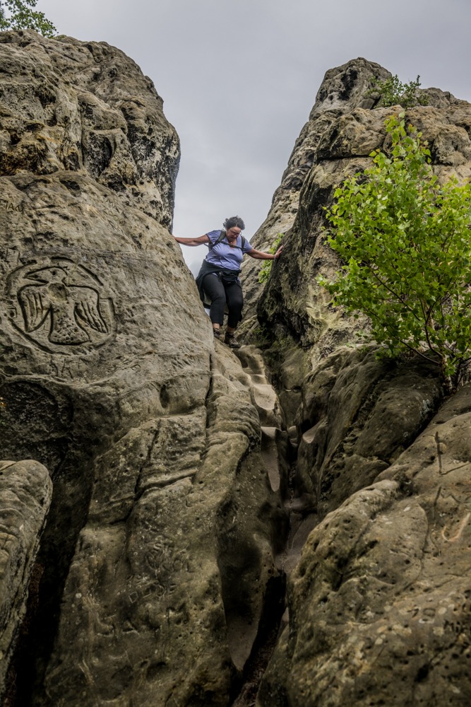 Diesmal keine Stufen, aber nicht weniger weniger steil ging es nach oben. Unsere amerikanischen Merrell-Treter bewährten sich im ostdeutschen Sandstein genauso gut wie in den roten Felsen im südlichen Utah.