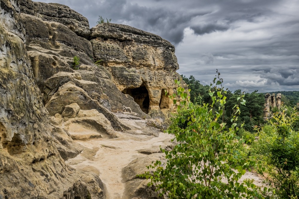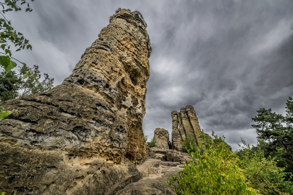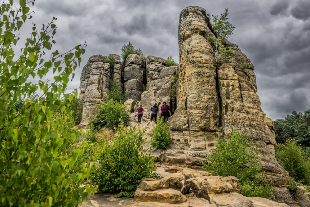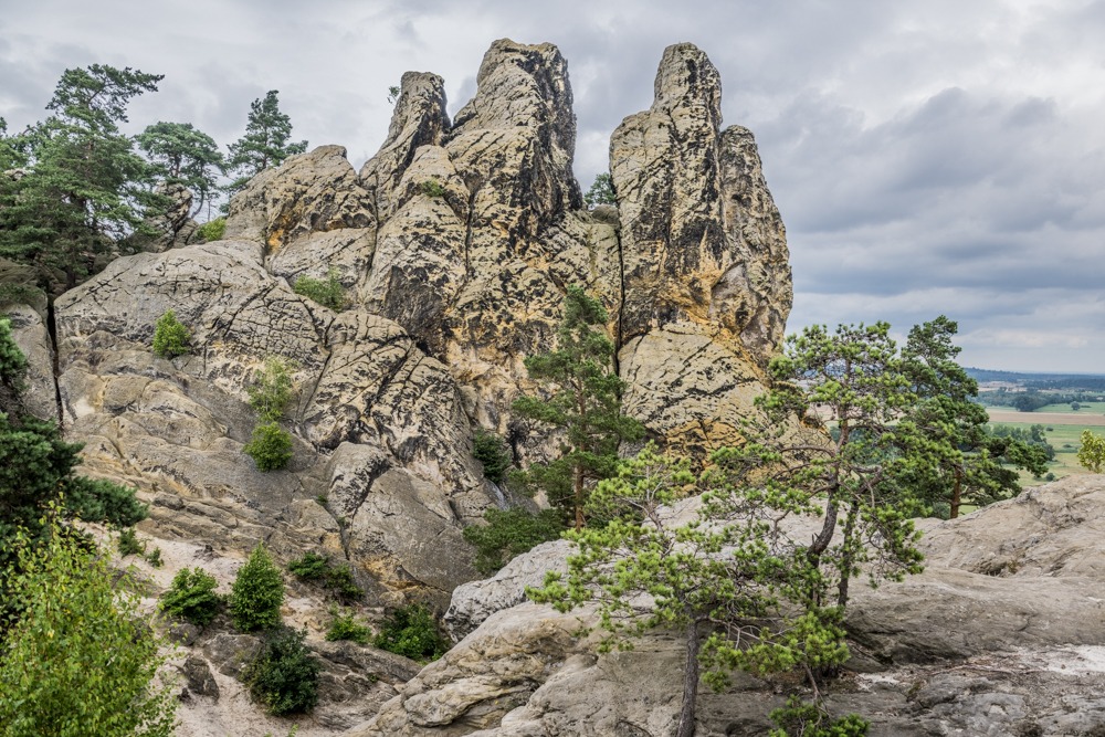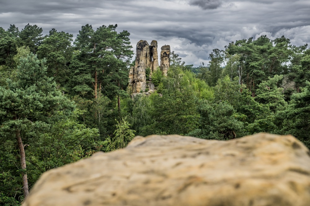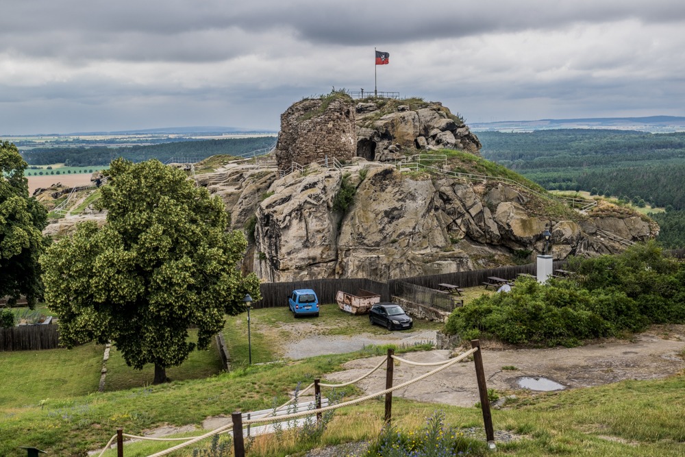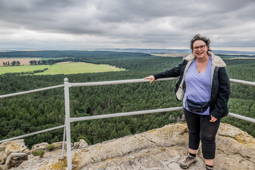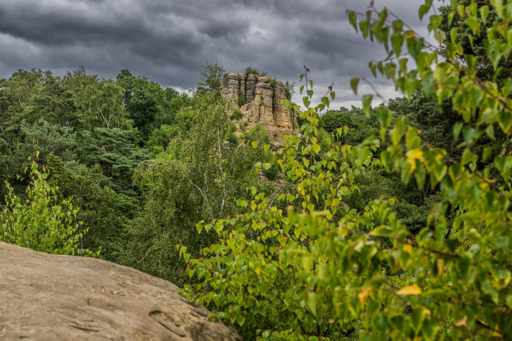 Für heute haben wir uns ein wenig Kraxelei vorgenommen. Etwas südlich von Halberstadt (eine Stadt, die von Goethe zweimal besucht wurde, einmal zu Lebzeiten Gleims, einmal nach seinem Tod) liegen zwei Sandsteinformationen mit außergewöhnlichem Aussehen. Wir hatten gestern schon versucht, einen Parkplatz als Ausgangspunkt zu finden, aber die Komoot App hatte eine so tolle Idee, wo man noch starten könnte. Also gaben wir diesen Punkt ins Navi ein und mussten mal wieder feststellen, dass es entweder keinen Satellitenempfang (von Handyempfang wollen wir gar nicht erst reden) gibt oder noch lange nicht alles erfasst ist. ODER: Ich habe in meinem Handy irgendwo hinterlegt, dass ich einen Pickup fahre und deshalb ungeteerte Straßen und schlechte Feldwege bevorzuge. Jedenfalls führte uns die Software zu diesem genannten Endpunkt. Und meinte dann, dass wir noch 10 Kilometer zu laufen oder fahren hätten.