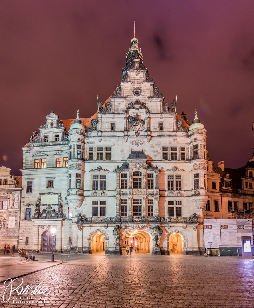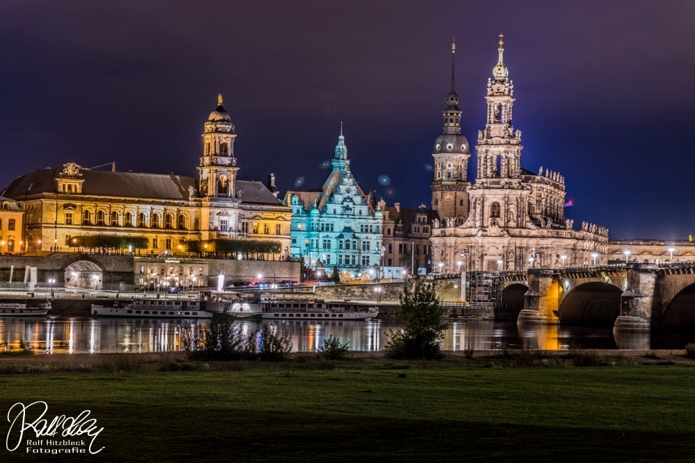 Nachdem wir uns an dem Anblick hin- und weggesehen haben, stellt sich so langsam auch der kleine Hunger ein. Knoppers haben wir nicht dabei, also müssen wir selbst was jagen. Aus dem Hotel dringen verführerische Düfte durch den Flur, aber uns ist nicht so nach Restaurant. Also suchen wir uns – die Dämmerung bricht langsam herein – die Königsklasse des schnellen Essens und werden in der Nähe der Altstadt auch fündig. Leib und Seele sind gestärkt, eine Wanderung durch die beleuchtete Altstadt kann beginnen. Wir finden in der Nähe der Staatskanzlei einen Parkplatz – der nach 20 Uhr sogar kostenlos ist, wir kamen um 19.56 Uhr an – und marschieren zu den Elbewiesen, um den Blick zu den Elbterassen zu genießen.