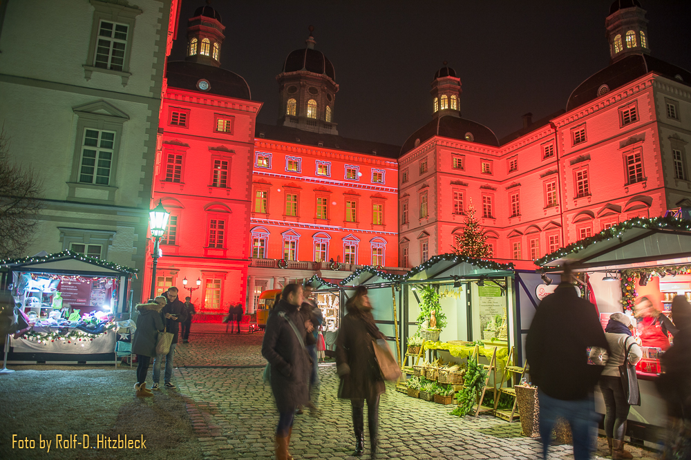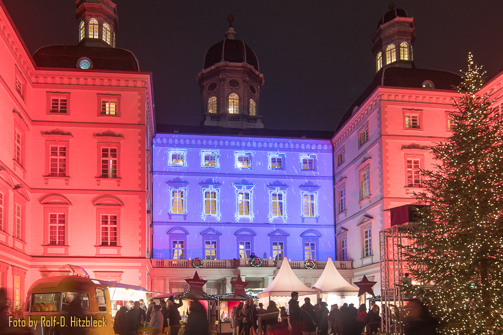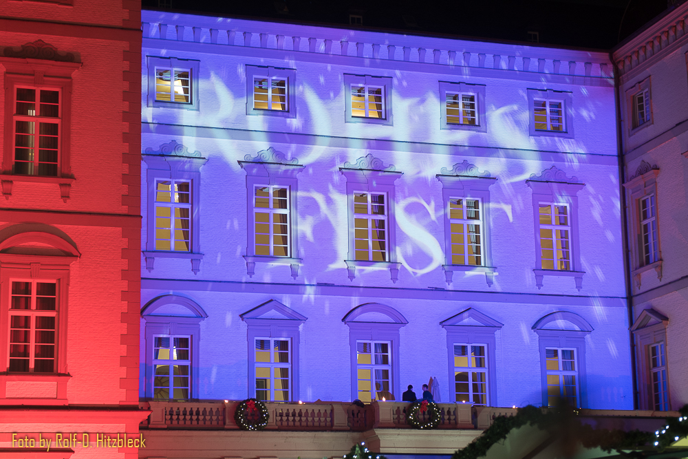 Auf dem Rückweg machten wir noch einen kleinen Abstecher nach Bensberg. Ich hatte gehört, dass das Schloss dort abends schön beleuchtet sei. War es auch. Vor dem Schloss fand ein Weihnachtsmarkt statt. Und das besondere: Auf diesem Weihnachtsmarkt war (zumindest zu Anfang) Eintritt zu bezahlen. Dafür wurde auch eine herrliche Laser-Lightshow geboten.