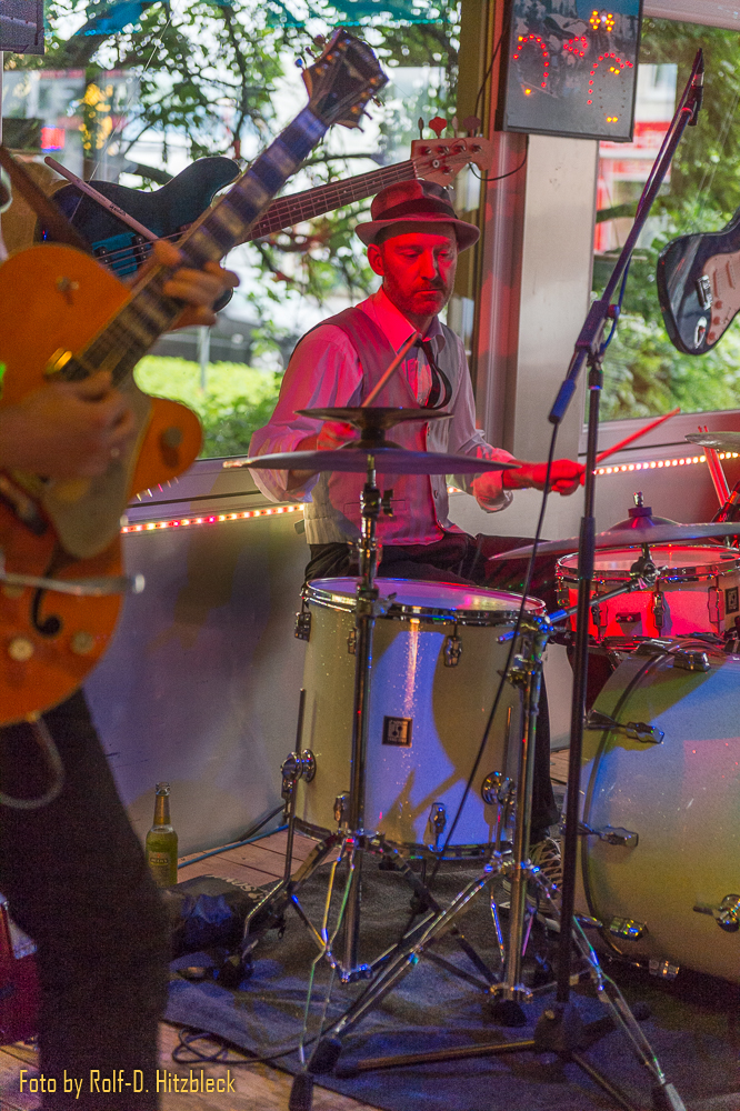 Und den lieferte die Gruppe Rockin‘ Rhonda and the Solid Studs. Ich traf ein, als die Band noch in den Vorbereitungen steckte. Will heißen: Es wurden mächtige Hamburger verdrückt, die mit denen aus den Fastfood-Tempeln nur den Namen gemeinsam hatten.