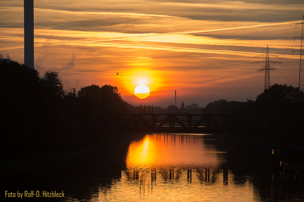 Weiter Richtung Westen ging es danach in Richtung Kaiserpark in Oberhausen. Die früher mal freien Parkplätze wurden mittlerweile für den größten Teil des Tages kostenpflichtig, aber auf der anderen Seite des Kanals, vor dem Sportstadion, kann man in direkter Nähe des Brückenaufganges noch für lau parken. Auf dem Weg dorthin fuhr gerade ein Schiff in den beginnenden Sonnenuntergang und ermöglichte diese Aufnahme.