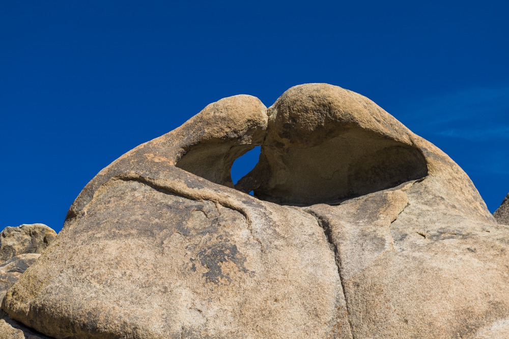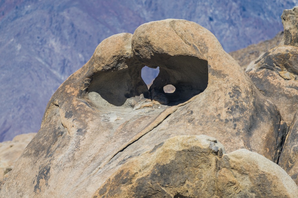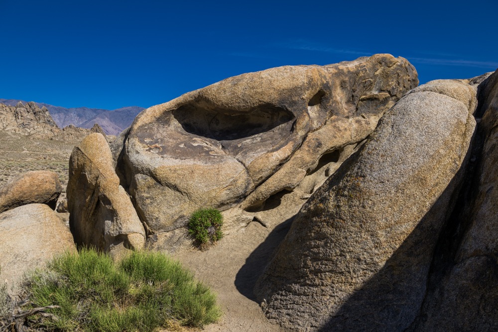 Lone Pine ist immer noch das verschlafene Nest, was es vor einigen Jahren schon war. Aber eine Neuerung hat Einzug gehalten: Die Stadt leistet sich eine Baustelle mit einer Straßensperre. Ausgerechnet die Whitney Portal Road, welche zum Anfang der sogenannten Movie Road führt, ist auf einem Teilstück gechlossen. Eine Umleitung ist ausgeschildert. Was wir nicht schlimm finden, führt die Strecke doch über die südliche Sektion der Hills. Allerdings bekommen wir die Miss Alabama nicht zu sehen. Ihr wisst nicht, was das ist? Auf dem abgesperrten Teilstück gibt es einen Felsen, der je nach Jahreszeit und Event als Gesicht bemalt ist. Miss Alabama halt.