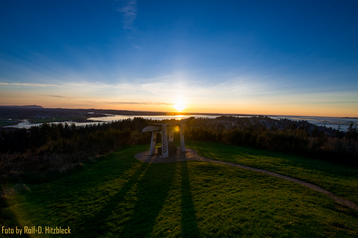 Vor dem Parkplatz mit Blick auf den Columbia River steht eine Reihe von Adirondack Stühlen, deren Einladung wir nicht widerstehen konnten. Wir ließen uns gemütlich darauf nieder und genossen einfach nur den Blick in die Landschaft. Da ich wegen des Zimmerumzuges meinen Rechner dabei hatte, konnte ich bei dieser Aussicht wunderbar schon diese Zeilen tippen. Die Astoria Column stellte netterweise sogar Gratis-Wlan zur Verfügung.