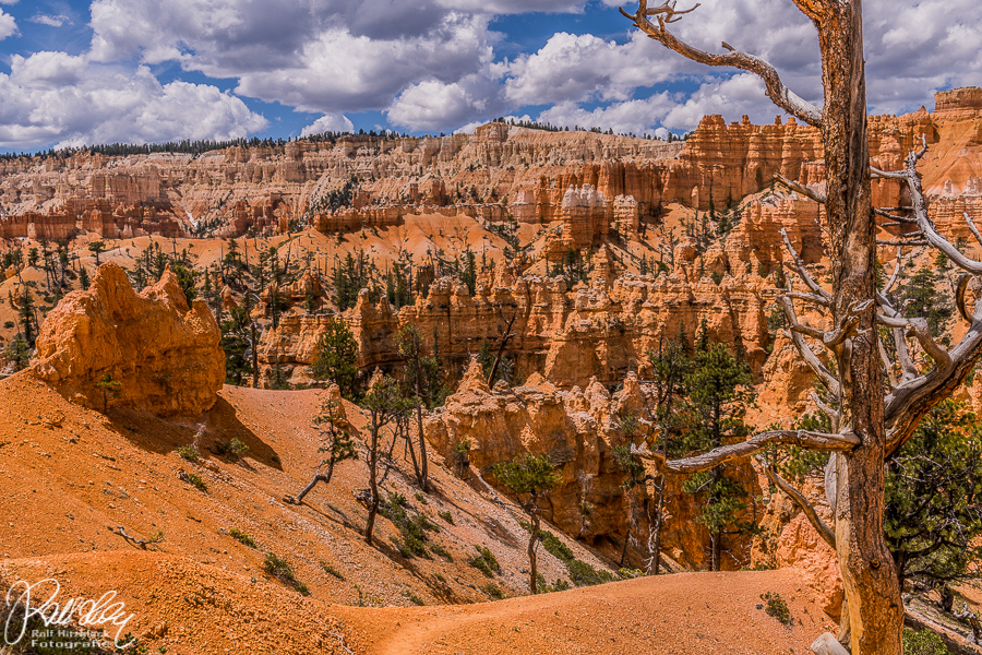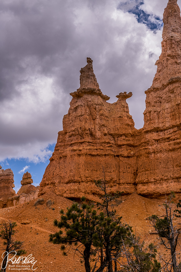 Meine Mutter überließen wir dem Bryce und machten uns auf die Wanderung ins Tal. Der Queens Garden Trail war offen, die Navajo Loop leider geschlossen. Auf dem Weg nach unten entlud sich (wie das bei analogen Clouds manchmal so üblich ist) ein kurzer Regenguss und verwandelte den Himmel auch sonst in grau. Das nutzte ich zu meinem Vorteil: Ich brauchte nicht groß zu fotografieren und wir liefen bis ans Ende des o.g. Trails, schauten der Queen ins Auge