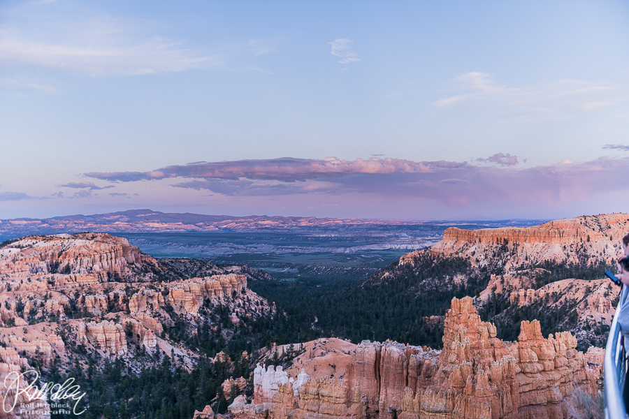 Nachdem diese Wissenslücken gefüllt waren, neigte sich die Sonne so langsam dem Horizont entgegen und wir waren froh, dass der Sunset Point nahe war. Während die Damen sich auf dem Parkplatz einen Snack als Abendessen schmecken ließen, musste ich Armer wieder schuften: Ich wollte eine Timelapseaufnahme vom Canyon machen. Habe es auch gerade geschafft, die Kamera aufs Stativ zu stellen. Meine D850 hat (wie möglicherweise auch andere SLRs) den Vorteil, dass nicht bei jeder Aufnahme der Spiegel hochgeklappt und der Verschluss geöffnet wird = silent mode.