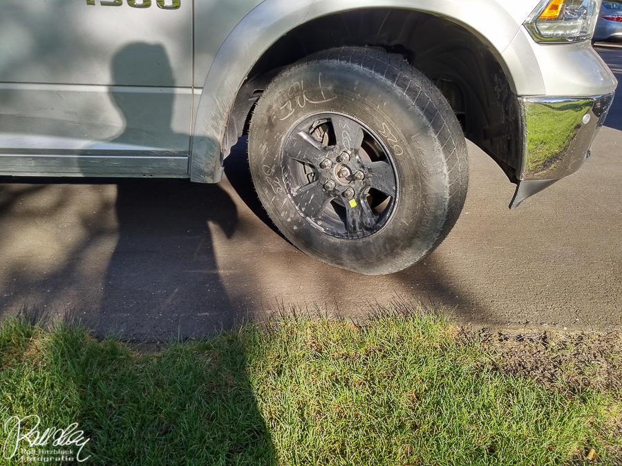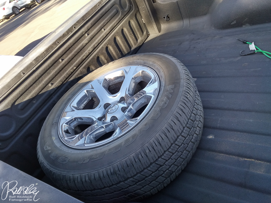 Nun ist ein Reifenwechsel eigentlich a) eine reine Männersache und b) nichts, was mich vom Hocker reißen könnte. Das eigentlich Interessante ist bei fremden Autos immer: Gibt es einen Ersatzreifen? Gibt es Werkzeug? Wo sind ersterer und letzteres? Den Reifen hatten wir schon unterhalb der Ladefläche gefunden, das Werkzeug (zum Glück einen vollständigen Wagenheber und kein Notflicksystem) gruben wir mit Hilfe der Bedienungsanleitung unter dem Beifahrersitz aus. Jetzt noch den Reifen aus seiner Verankerung lösen (war auch nicht ganz ohne) und dann konnte der eigentliche Teil des Reifen wechselns beginnen.