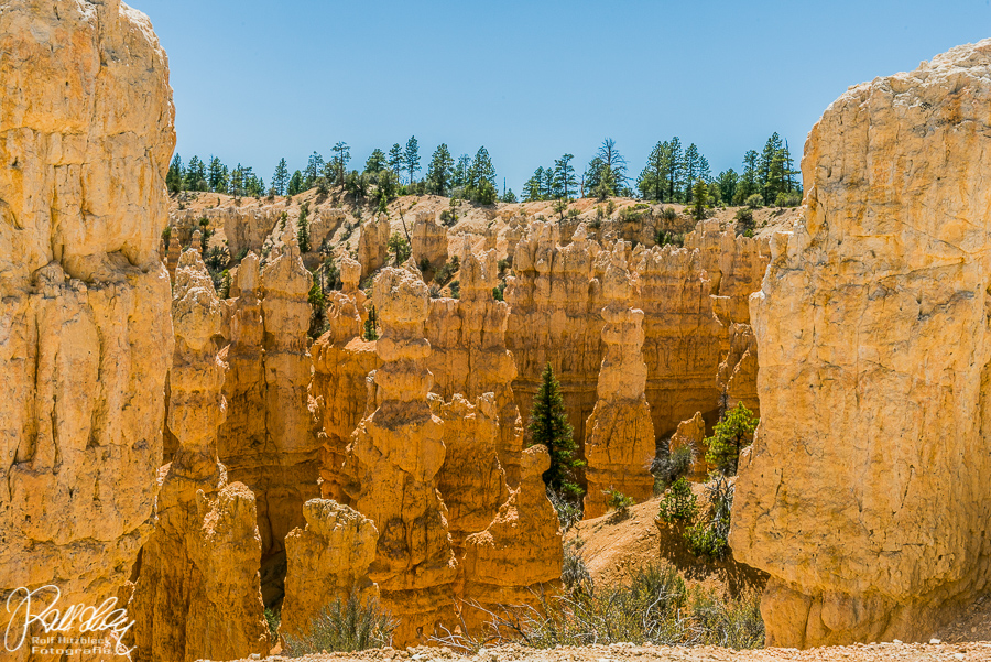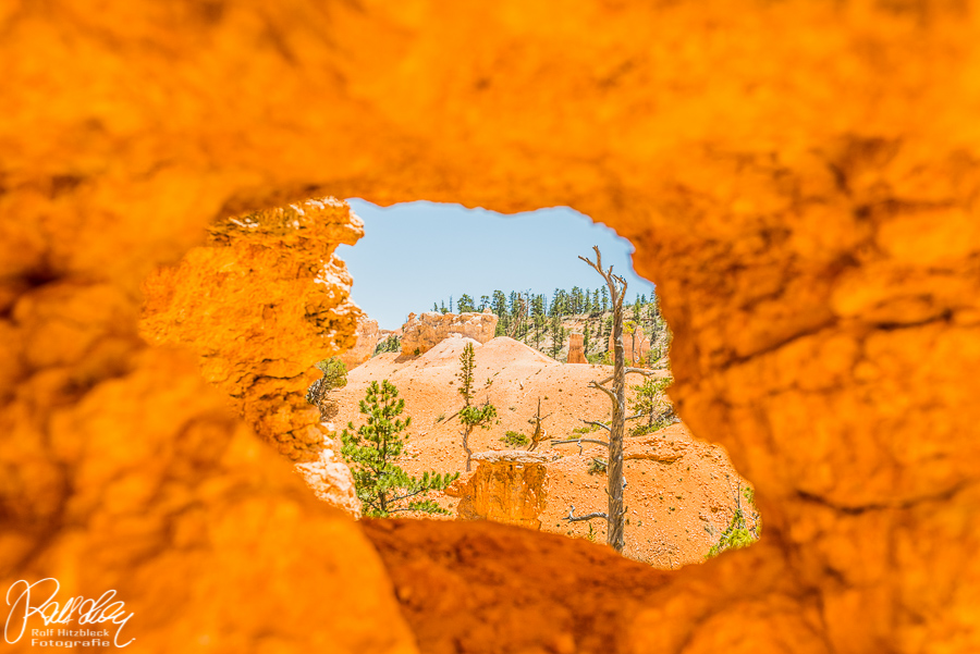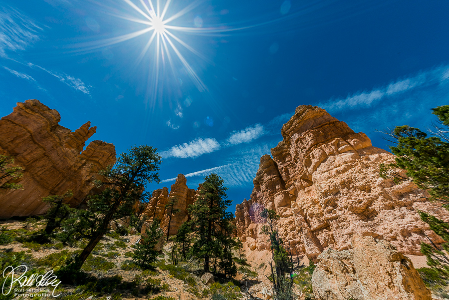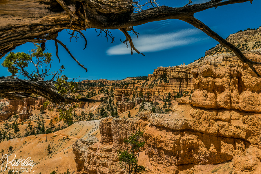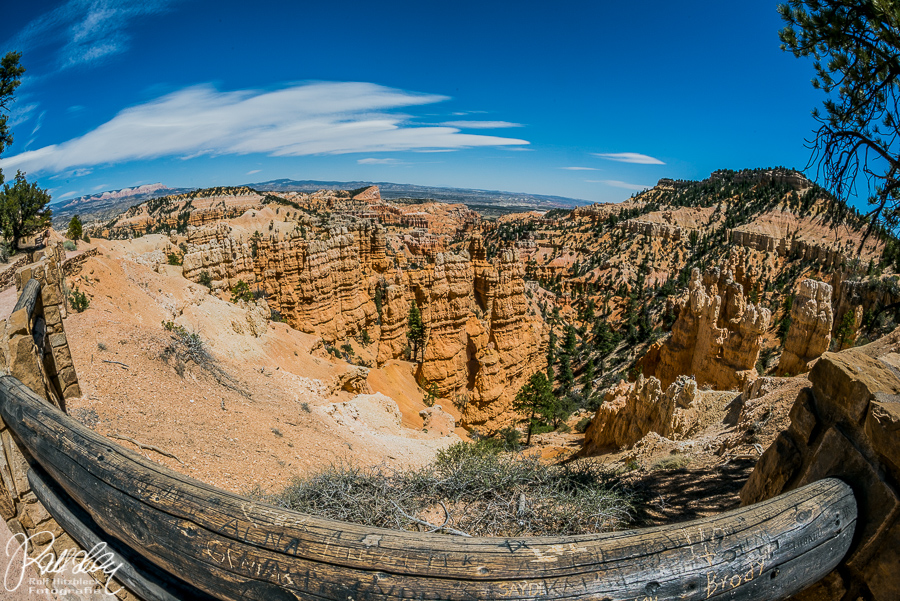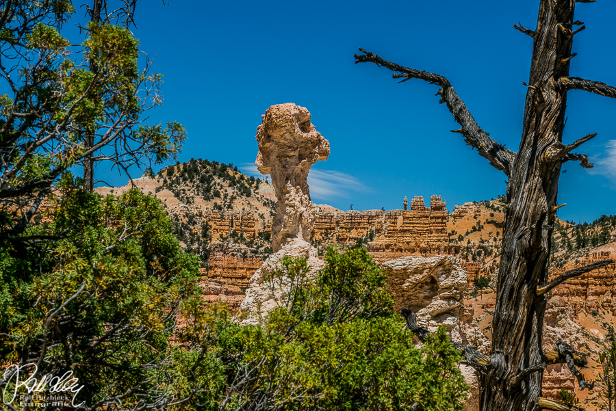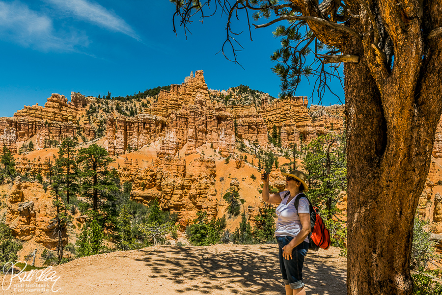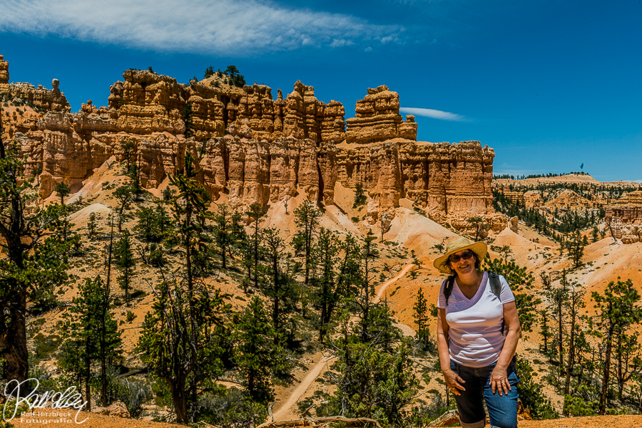 Wer uns kennt, weiß, dass wir den Bryce Canyon nicht einmal, nicht zwei  Mal, nicht drei Mal, sondern schon wesentlich öfter besucht haben. Zuerst als kinderloses Ehepaar, dann mit meinen Eltern (bei denen er einen mehr als bleibenden Eindruck hinterlassen hat) und anschließend mit den Kids. Und man sollte meinen, wenn man einmal einen der Piddel (im Fachjargon Hoodoo genannt) gesehen und vielleicht sogar fotografiert hat, dann hat man alle gesehen und weitergehende Fotografiererei erübrigt sich. Aber vorsichtshalber und mehr aus Gewohnheit hatte ich die Ausrüstung doch mal mitgenommen. Fühlt sich sonst so leer und leicht am Rücken an und dann würde ich meiner Mithikerin vielleicht noch weglaufen.