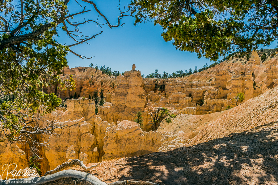 Den Park, der seinen Namen wegen der prächtigen Farben wirklich vom Filmehersteller abgestaubt hat, hatten wir in früheren Jahren schon ein- oder zweimal besucht. Allerdings mehr auf der „Durchreise“, d.h. Straße entlangfahren, an jedem Viewpoint ein Foto machen und schnell wieder weg. Diesmal hatten wir mehr Zeit mitgebracht und beschlossen, zuerst mal den Grand Parade Trail zu laufen mit 1,5 Meilen. Besonders reizvoll die angebotenen Boxcanyons.
