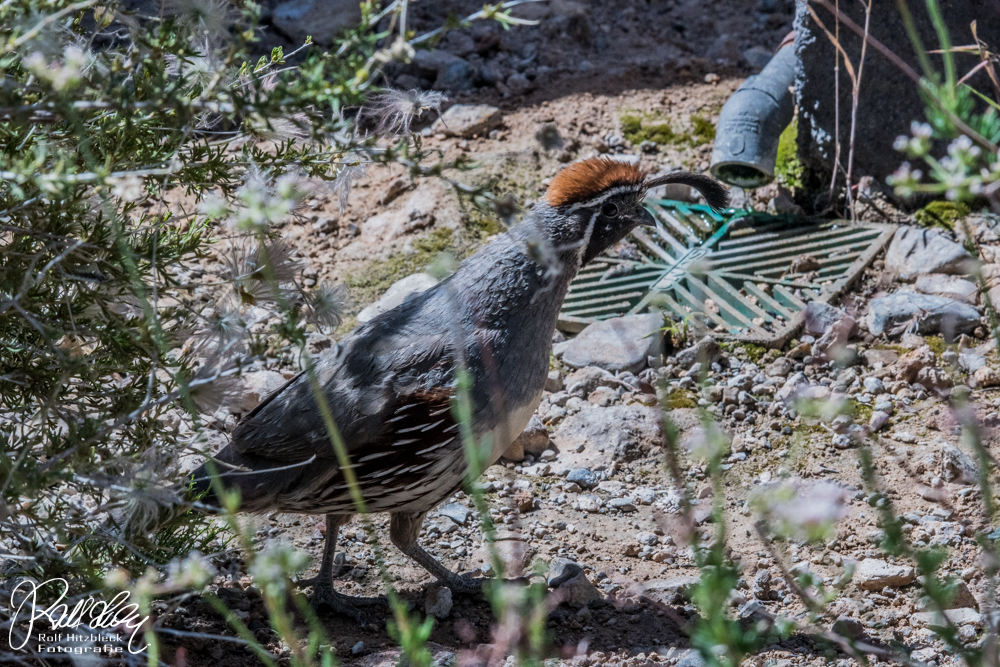 Die Kolibri-Tränken, die dort rumhingen, wurden zu meinem Leidwesen nicht besucht, dafür erwischte ich einen süßen Vogel, der mit einer Beere oder einem Kern im Schnabel an der Tränke herumhüpfte.