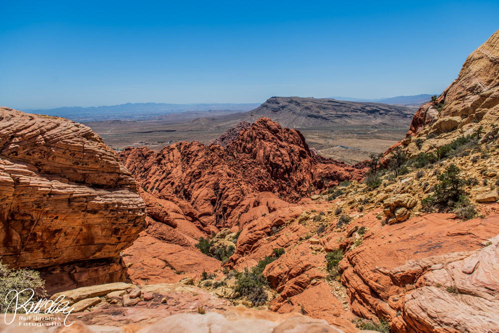 Am Ende des Tanks (wir hatten uns schon so gefreut, dass wir da waren) ging es noch einmal den Berg rauf und wir hatten einen tollen Überblick über die Red Rocks und das dahinter liegende Tal.