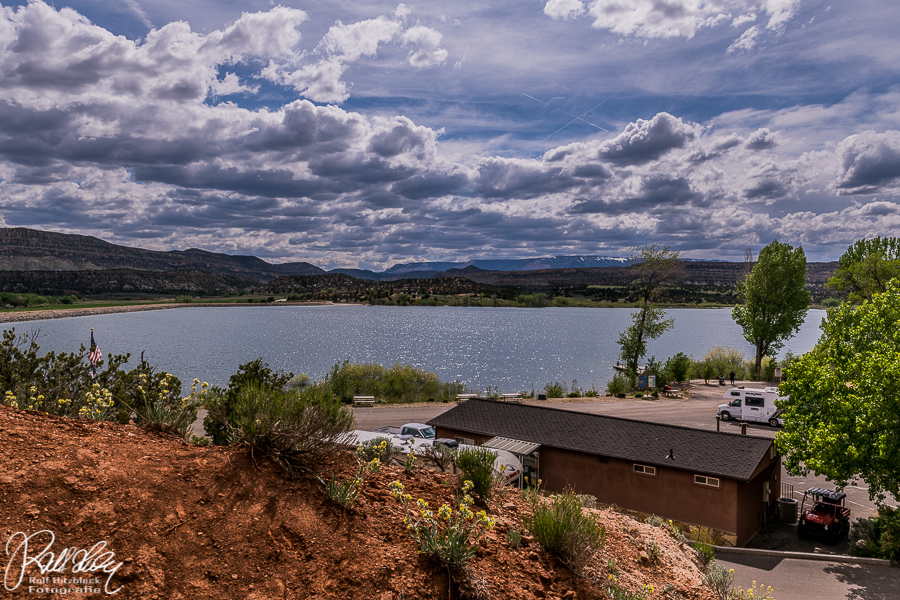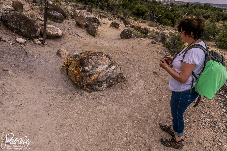 In Escalante zurück bogen wir nach rechts ab in den Petrified Forest State Park. Dieser liegt an einem schönen – und mückenfreien – See und wir genehmigten uns das lange fällige Picknick. Der Statepark bietet zum einen für Senioren einen langen petrified log und einen süße kleine Schleife mit versteinerten Artefakten.