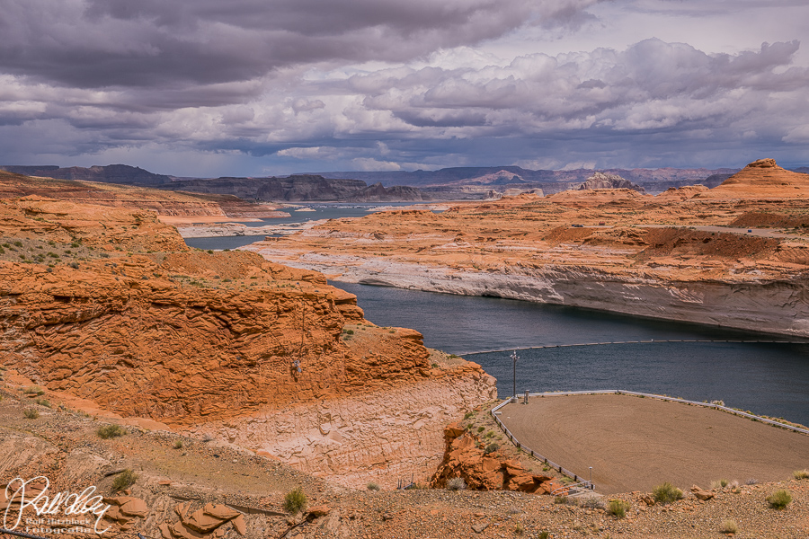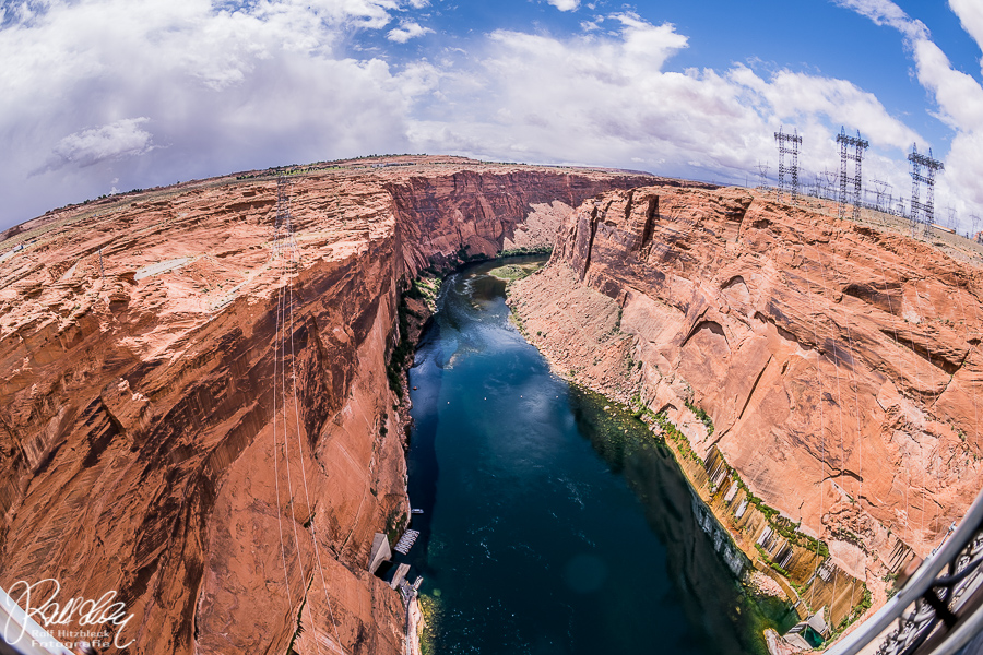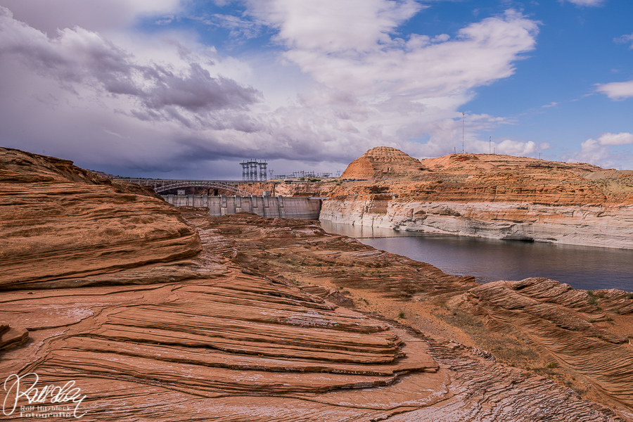 Zuerst besuchten wir unsere ehemalige „Badestelle“. Kurz vor dem Damm kann man rechts auf eine Dirt Road einbiegen, nach weniger als einer Meile auf einem Parkplatz den Wagen abstellen und dann noch ein paar hundert Meter die Felsen herablaufen und sich in die Fluten stürzen. Aber da wir vom bergauf Laufen erstmal genug hatten und noch andere Sehenswürdigkeiten auf der Tagesordnung standen, verzichteten wir auf ein Bad und fuhren über den Glen Canyon Damm zum Carl Hayden Visitor Center.