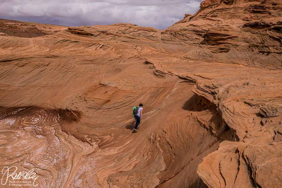 Heute schickte ich meine Göttergattin ganz weit weg, damit sich micht nicht durch Quitschen nervös machen konnte und versprach ihr, in einem Stück in Kürze zurückzukommen. Das Objektiv, das ich diesmal verwendete, das 14-24mm, hat speziell für diesen Einsatzzweck zwei entscheidende Vorteile: 1. bekam ich schon mit 18 mm die komplette Schlucht drauf und 2. hat diese Optik die Fähigkeit, „um die Ecke zu schauen“. D. h. selbst als ich nicht direkt an der Kante stand, nahm die Linse noch Dinge auf, die ich mit bloßem Auge nicht sehen konnte = die äußerste Kante der Schleife. Faszinierend.
