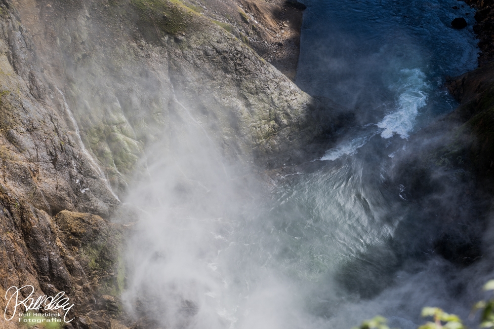Unten sehen wir genau das, was wir erwartet hatten: Einen Wasserfall von oben, wie das Wasser in die Schlucht stürzt.