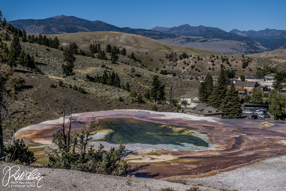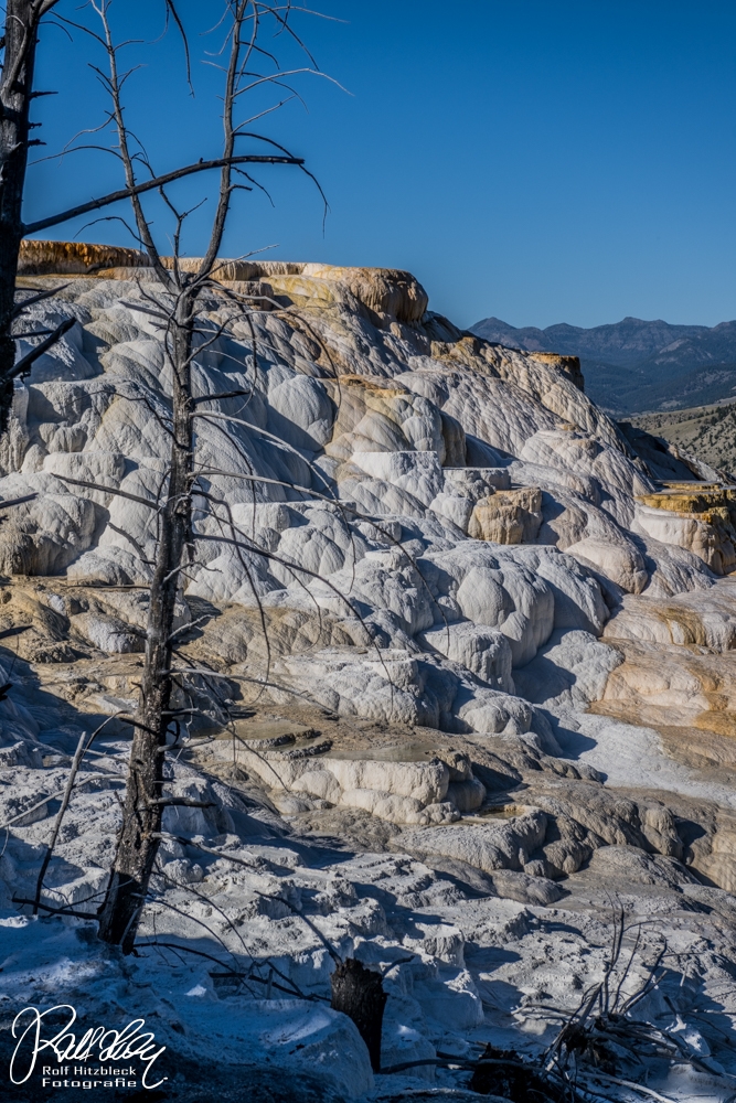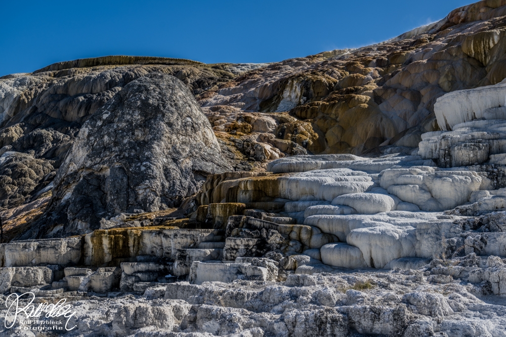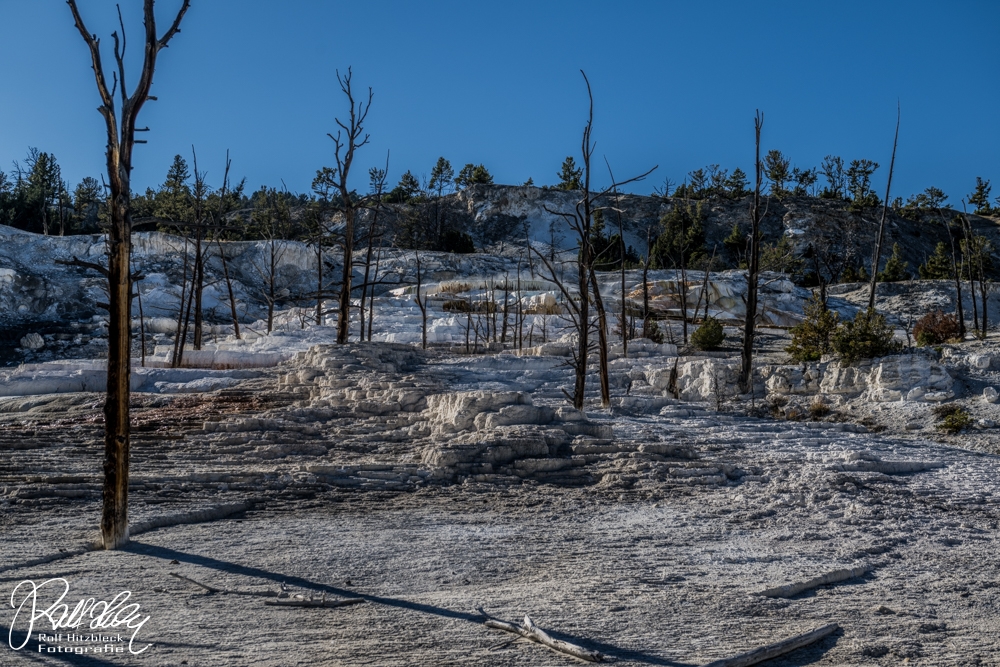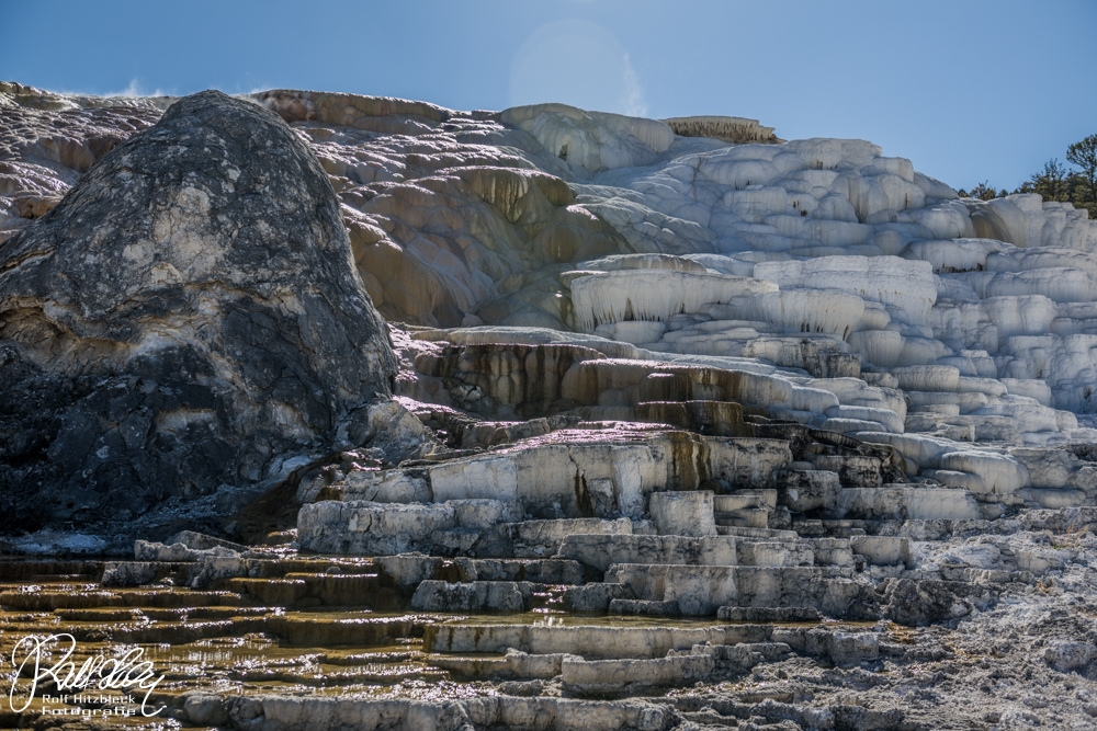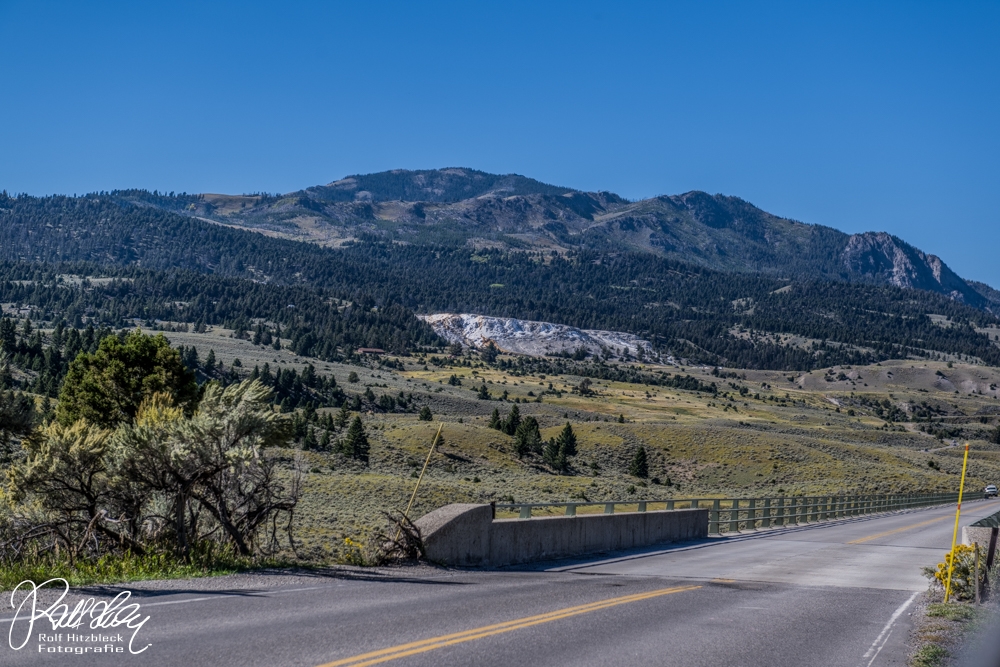 Die weitere Tour geht über Mammoth Hot Springs, eine der attraktivsten Heißquellengebiete des Park. Zumindest war es das früher. Die teilweise schneeweißen Sinterterrasen sind ein unnachahmliches Naturschauspiel, so denn Wasser herunterläuft. Karin und ich erinnern uns noch daran, wie das vor 36 Jahren war. Heute sind leider viele der „Fälle“ ausgetrocknet und starren einfach nur weiß den Besucher an.