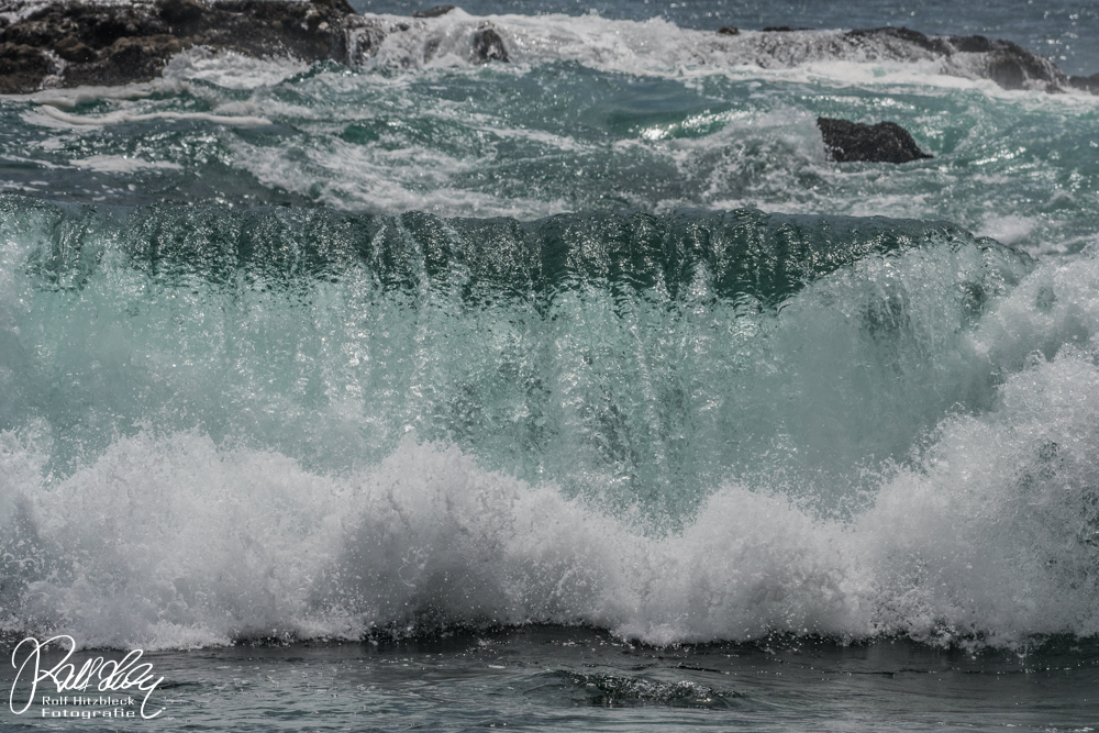 In der anderen Richtung geht es ins offene Meer, die Wellen brechen mit brachialer Gewalt an die Buhnen.