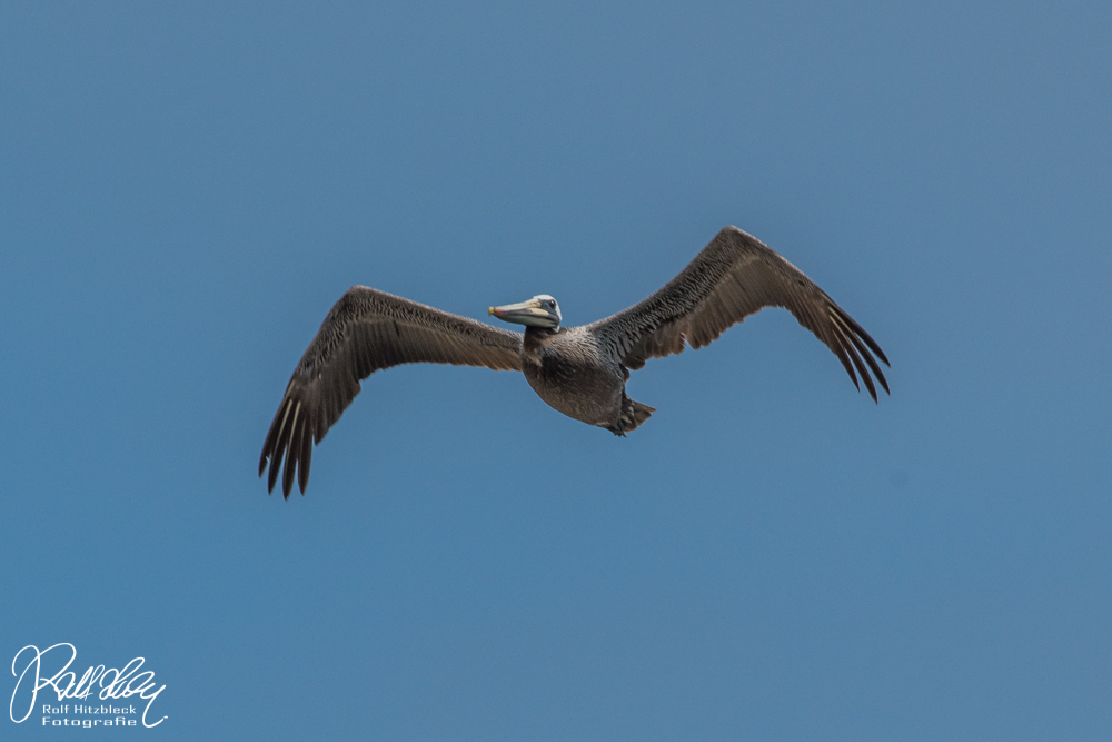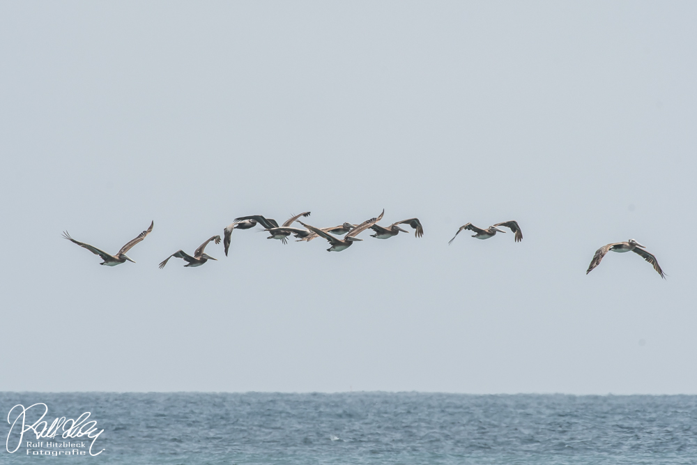 Ich nutze die Gelegenheit, auf die vorbeifliegenden Pelikane zu halten.