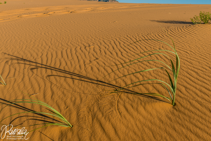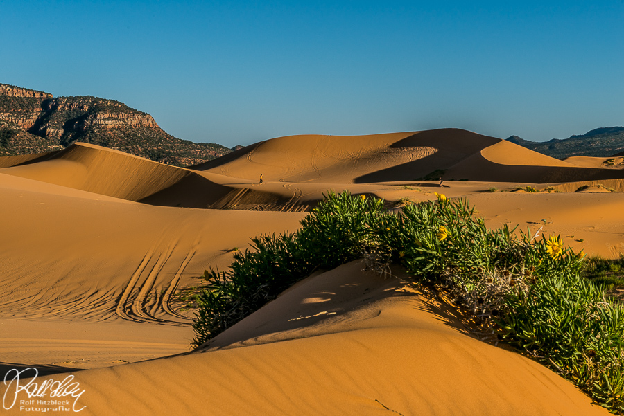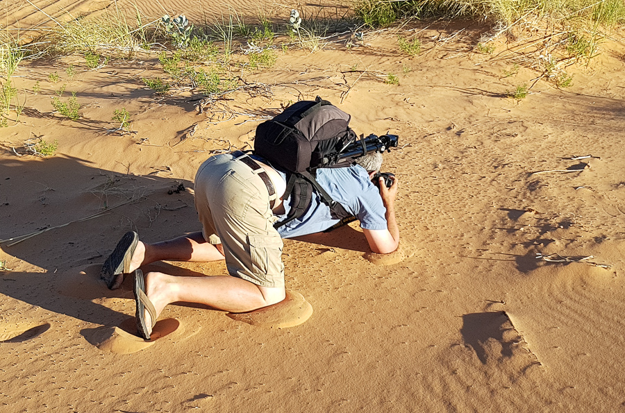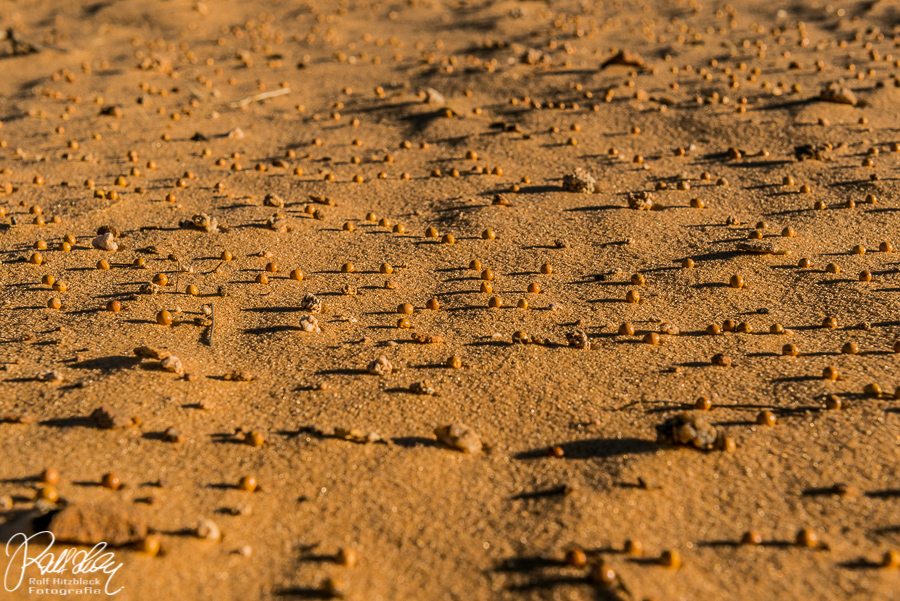 Bei unserem „Spaziergang“ durch den tiefen Sand – etwas, was wir eigentlich zu vermeiden suchen – fielen uns immer wieder die herrlichen Blumen auf, die einen so wunderbaren Vordergrund und farblichen Kontrast zu restlichen Umgebung bieten. Und irgendwelche dieser vielen Pflanzen (ob es diese gelben waren, weiß ich nicht) warfen Samenkapseln ab. Und damit ihr mal seht, welche Mühen der Fotograf dieses Blogs auf sich nimmt für gute Fotos, hier ein Making of und das Resultat: