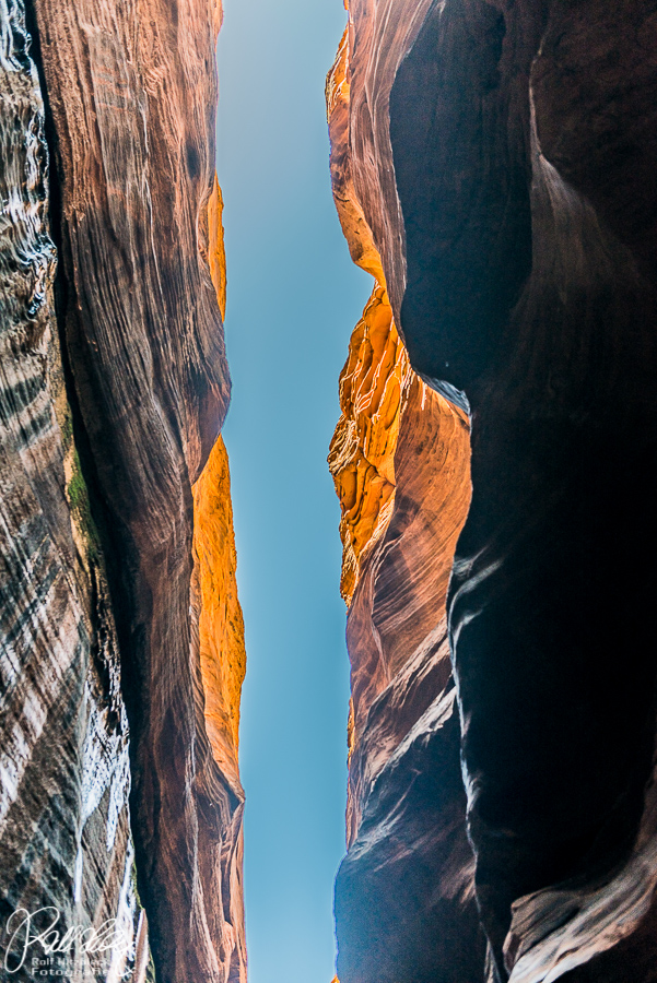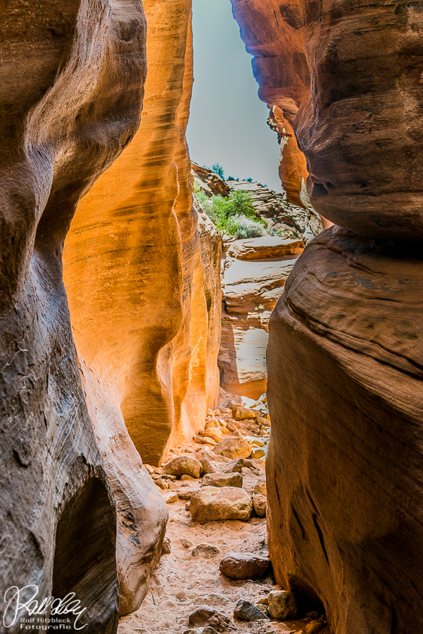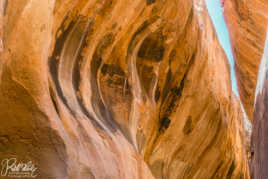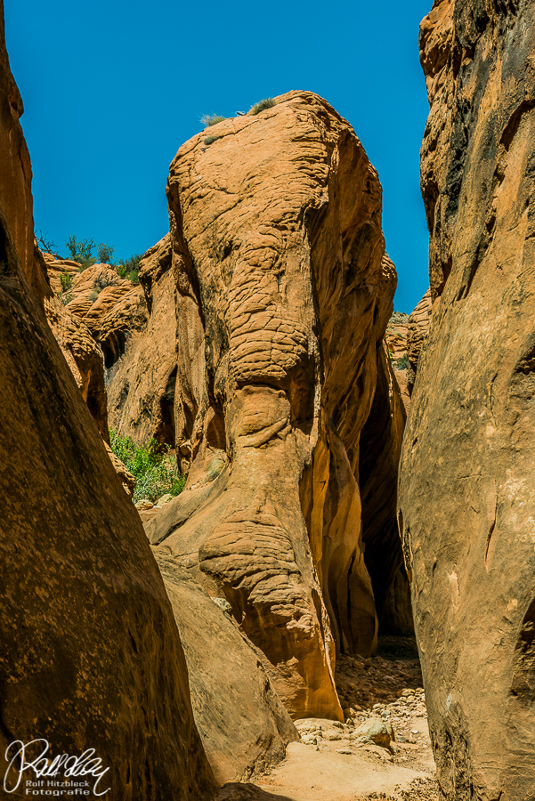 Senkrechte Felswände, Arches, merkwürdige Figuren, Himmel am Ende des „Tunnels“.
