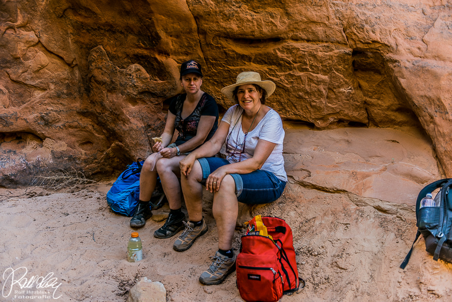 Unsere Sachen, speziell unsere Schuhe, wollten wir in dieser zähflüssigen, übelriechenden Masse nicht unbedingt einfärben, so dass wir umkehrten und in den Canyon des Paria River einbogen. Dieser war nicht ganz so spektakulär, bot aber an einer Stelle die Möglichkeit einer schönen Mittagspause im Schatten.