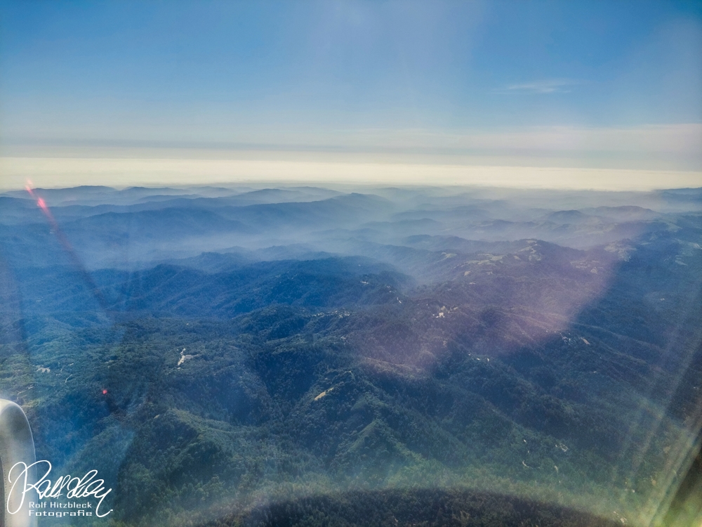 Der Flug nach San Francisco führt an der Küste vorbei, man sieht deutlich, wie sich der Nebel bis zum Strand hinzieht und es dann sonniger wird.