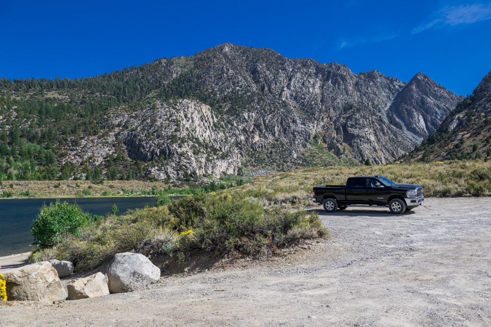 Wir hatten uns für heute auf die Fahne geschrieben, die Gegend nördlich von Bishop zu erkunden. Ein Ziel, von dem ich schon lange träume, sind die Säulen am Crowley Lake. Selbiger liegt ca. eine halbe Autostunde nördlich von Bishop und zieht sich ein paar Meilen entlang der 395. Wenn man am südlichen Ende in eine Straße einbiegt, gelangt man auf asphaltiertem Untergrund ca. 4 Meilen weit. Dann macht (so Alltrails) der Weg eine scharfe Kurve und es geht auf einer Dirtroad weiter. Soweit so gut. Mit einem Sportwagen wäre hier der Weg zu Ende (haben wir später erfahren). Man kann also jetzt zu Fuß ca. zwei Meilen laufen oder man hat ein äußerst geländegängiges Gefährt unter dem Hintern. Beschreibungen im Internet wiesen deutlich darauf hin, dass ein Teil der Wegstrecke nur mit einem Fahrzeug mit Vierradantrieb und hoher Bodenfreiheit zu passieren sei. Vor allem, weil es auch sandig sei. Ich bekam meine Zweifel, ob wir wirklich die Strecke fahren sollten. Schließlich waren wir vor einigen Jahren mal im tiefen Sand trotz Vierradantrieb elendig steckengeblieben.