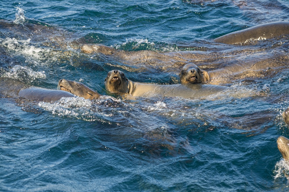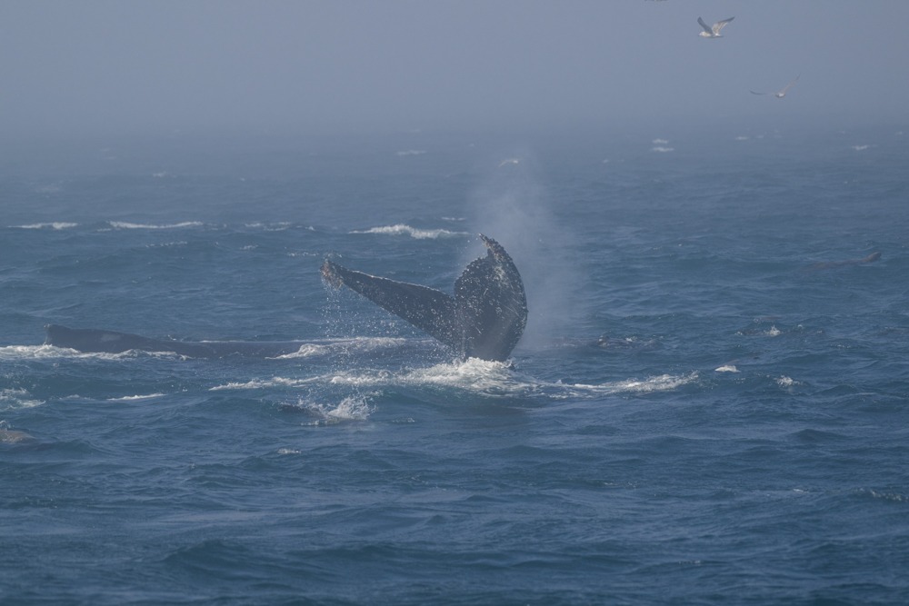 Während wir versonnen auf das Meer starren, fallen uns immer wieder an fast der gleichen Stelle Unregelmäßigkeiten auf. Wale. Man kann sie wirklich auch auf diese Entfernung noch erkennen. Anscheinend eine Mutter mit ihrem Kalb, so eng und synchronisiert, wie die Blasfontänen aus dem Wasser steigen. Es ist schon etwas anderes, Tiere im Zoo zu sehen oder sie in der freien Wildbahn zu stalken.
