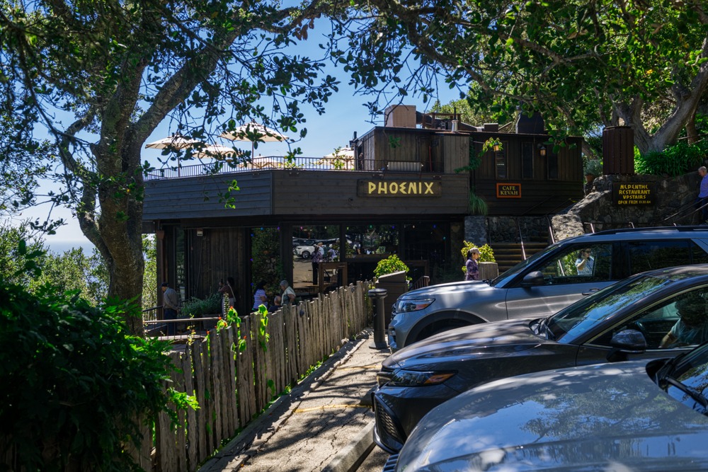 Dann wird es lebhaft und wir erfahren, wohin die ganzen Autos unterwegs sind: Direkt oberhalb der Steilküste gibt es ein Restaurant namens Nepenthe. Es gibt reichlich Parkplätze. Aber deswegen kommen die Leute nicht hierhin. Sie kommen wegen tollen Aussicht auf die Landschaft und die Aussicht, was zu Essen und zu trinken zu bekommen.