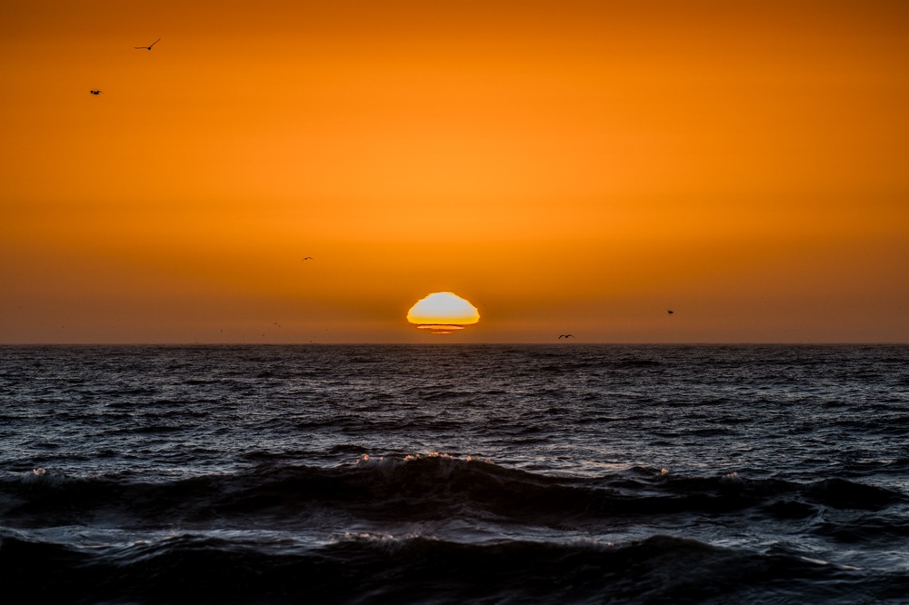 Schließlich macht sich die Sonne auf den Weg nach ganz unten. Sie plumpst bestimmt gleich über den Rand der Scheibe.