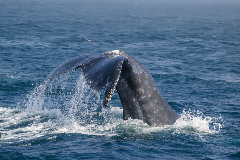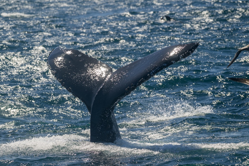 Die Wale könnten wir zwar fotografieren, aber Ihr könntet sie nicht erkennen. Daher freut es mich, ein anderes Tier in freier Wildbahn zu erwischen. Von gestern wissen wir: Es geht keine Gefahr von Schmetterlingen aus. Folglich traue ich mich nah ran.
