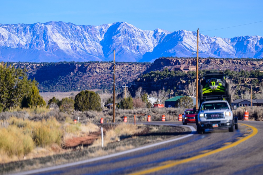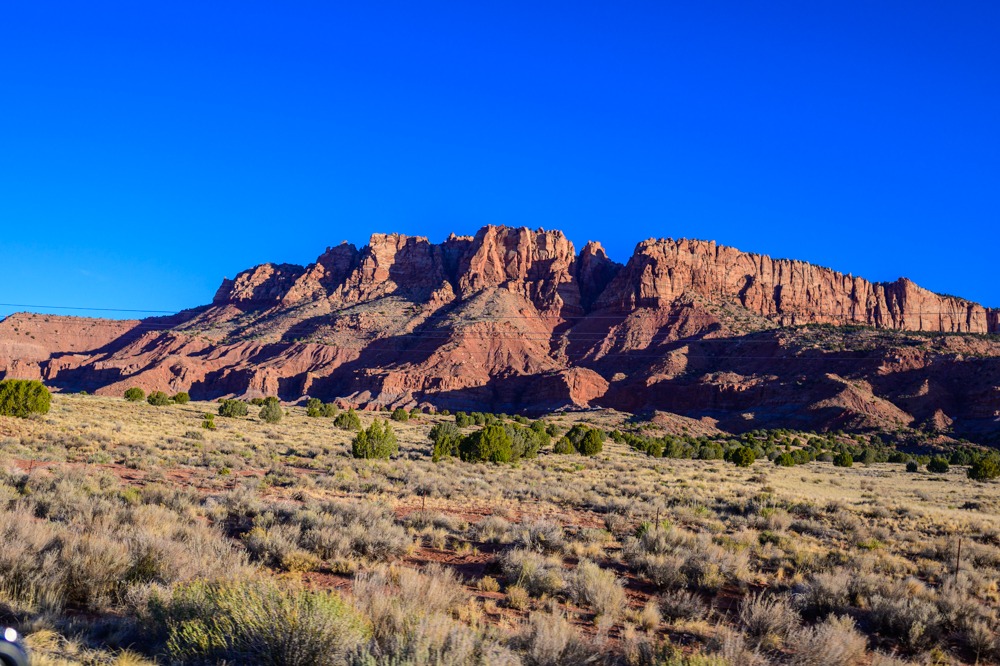 Der Weg führte uns nach Süden über Fredonia auf die 389, vorbei an vom Morgenlicht angestrahlten roten Felsen, durch Colorado City, einer ehemals kleinen Mormonensiedlung, die in den letzten Jahren ganz gewaltig aufgebohrt wurde. Aber man sagt den Mormonen ja eine große Geschäftstüchtigkeit nach.