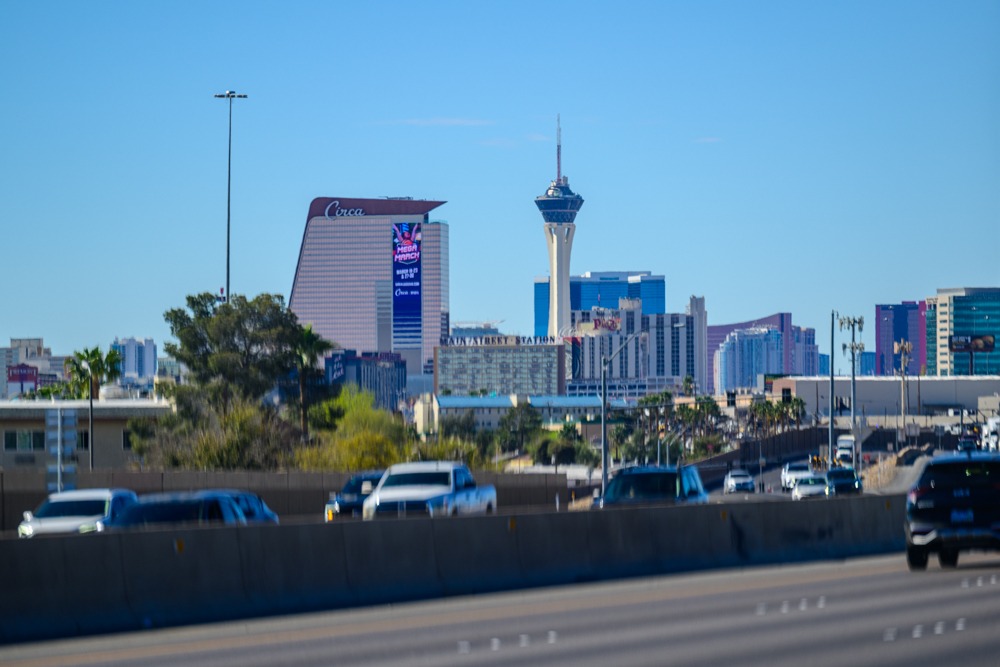 Während wir auf der Autobahn am Strip vorbeifahren, ein letzter Gruß an die Spielhöllen, die wir nie genutzt haben.