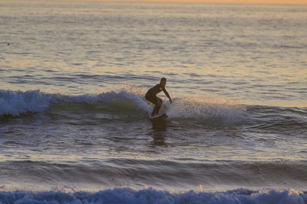 Surfer nutzen die relativ niedrigen Wellen aus, andere lustwandeln einfach nur an der Wasserkante entlang.