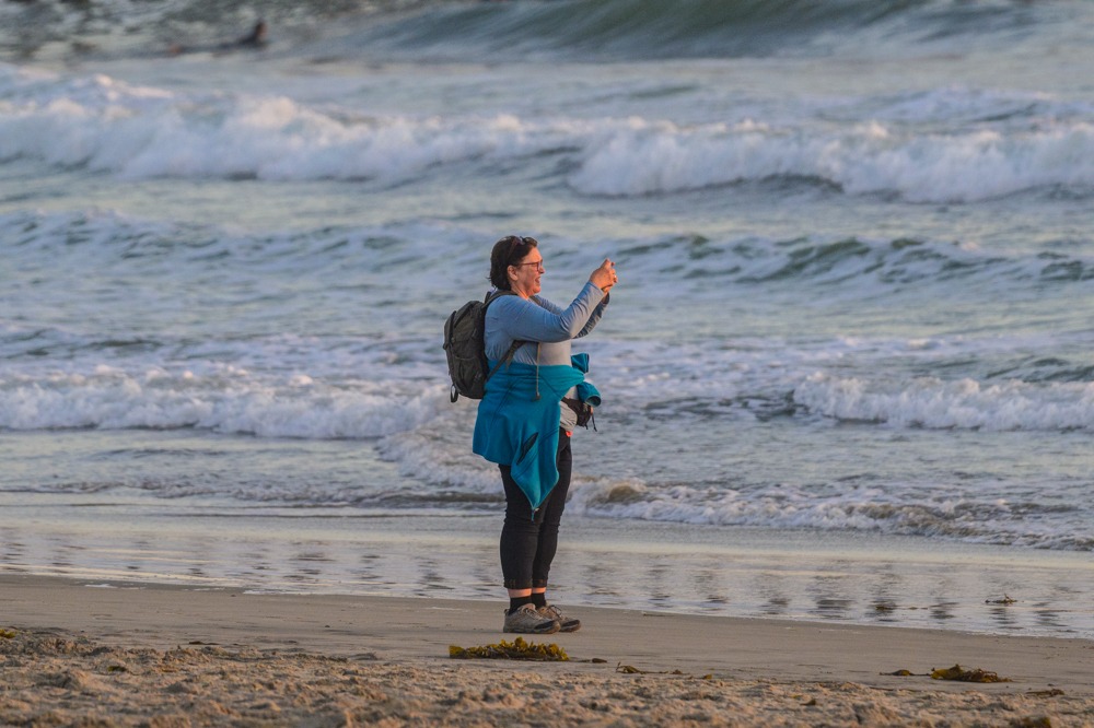 Ja, wir können das Meer sehen, aber am Strand ist es noch schöner. Mittlerweile ist es 18 Uhr geworden und die Sonne bewegt sich auf den Horizont zu. Schnell wieder ins Auto und die fünf Minuten zum Strand fahren.
