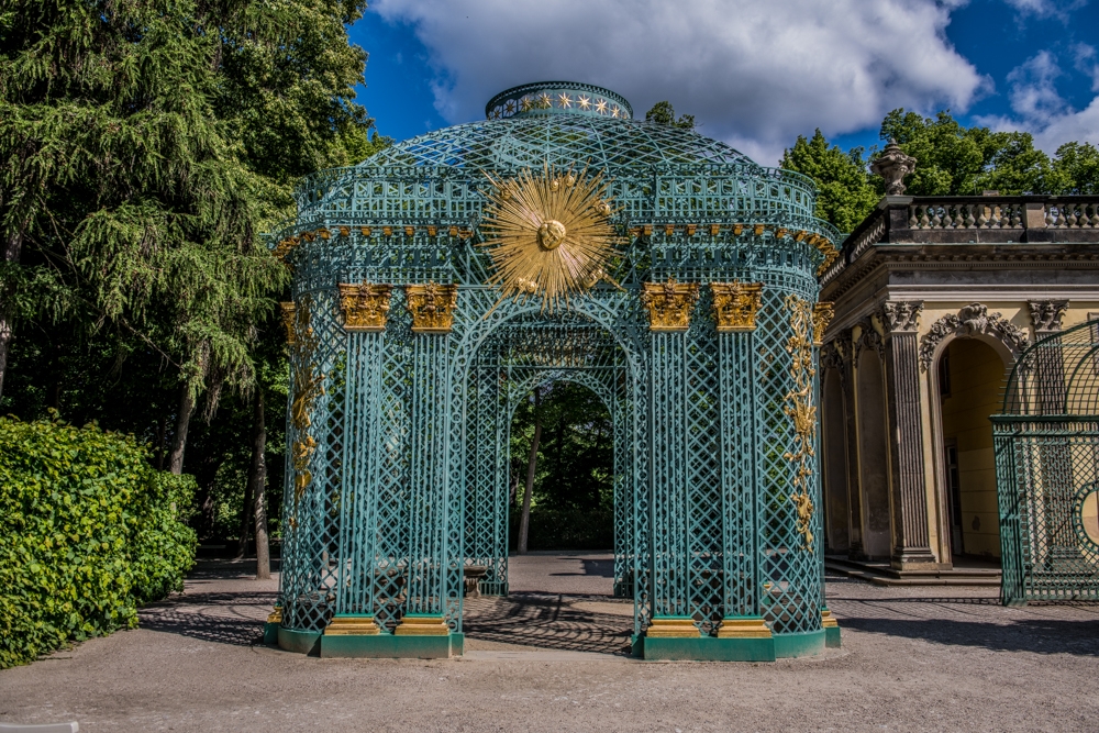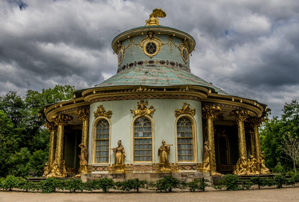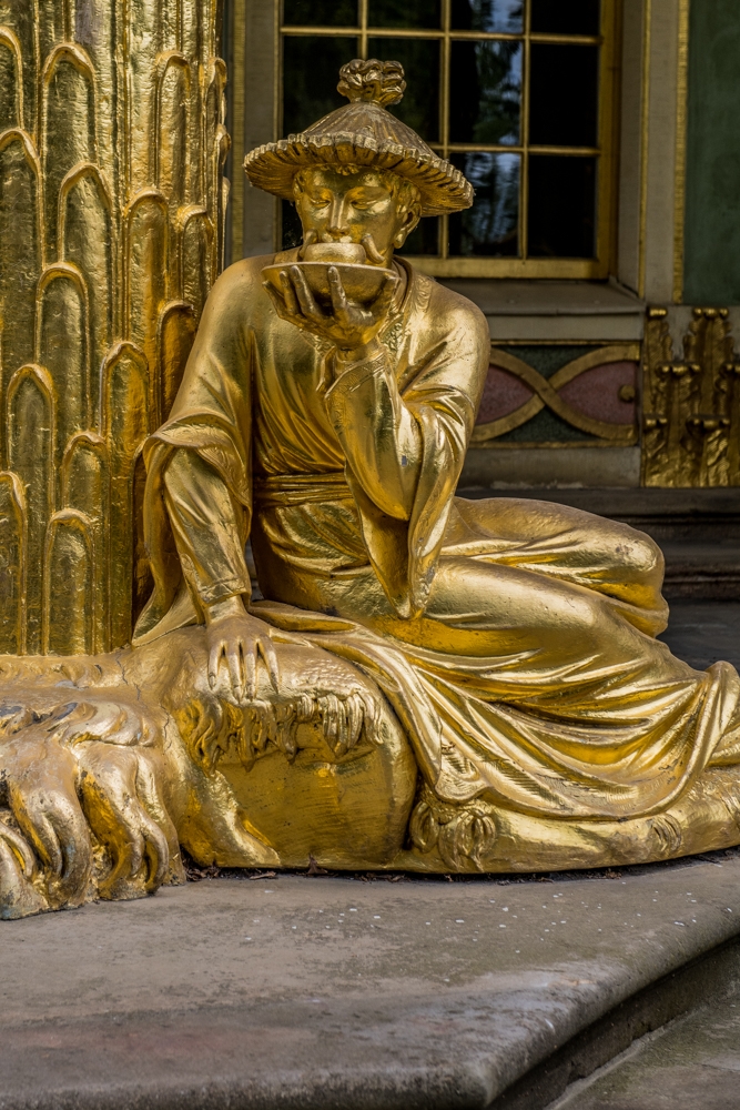 Nächstes Ziel war das Chinesische Haus. Dort standen gleich mehrere Bedienstete dekorativ in der Gegend rum. Ob sie wohl die Corona-Maßnahmen beim Betreten überwachen sollten? Oder nur aufpassen, dass keiner die goldenen Statuen anpackt?