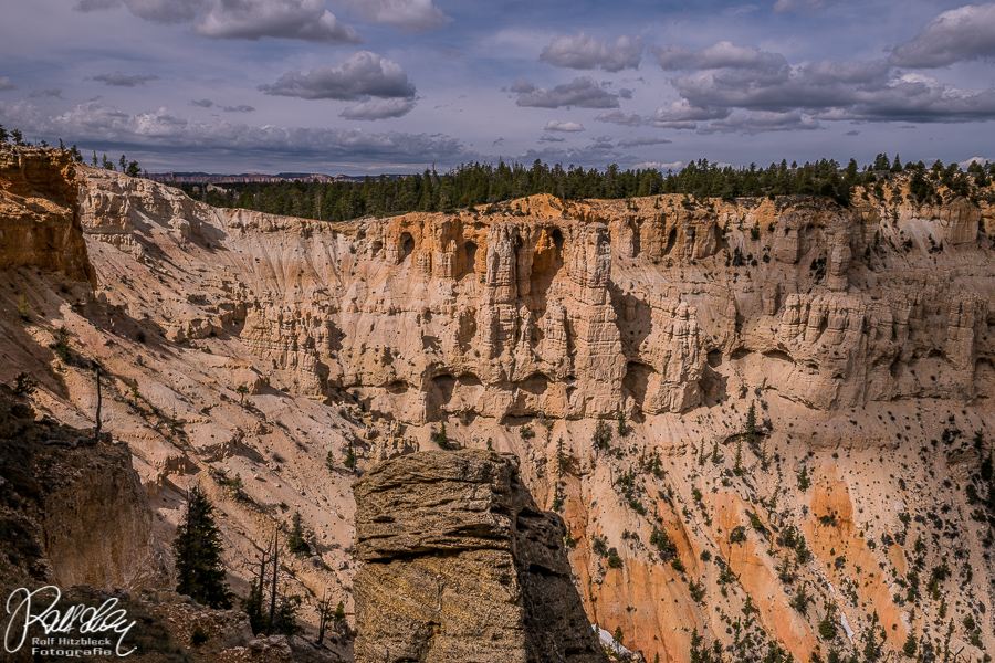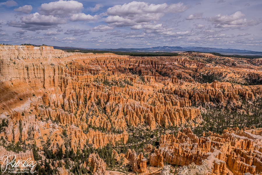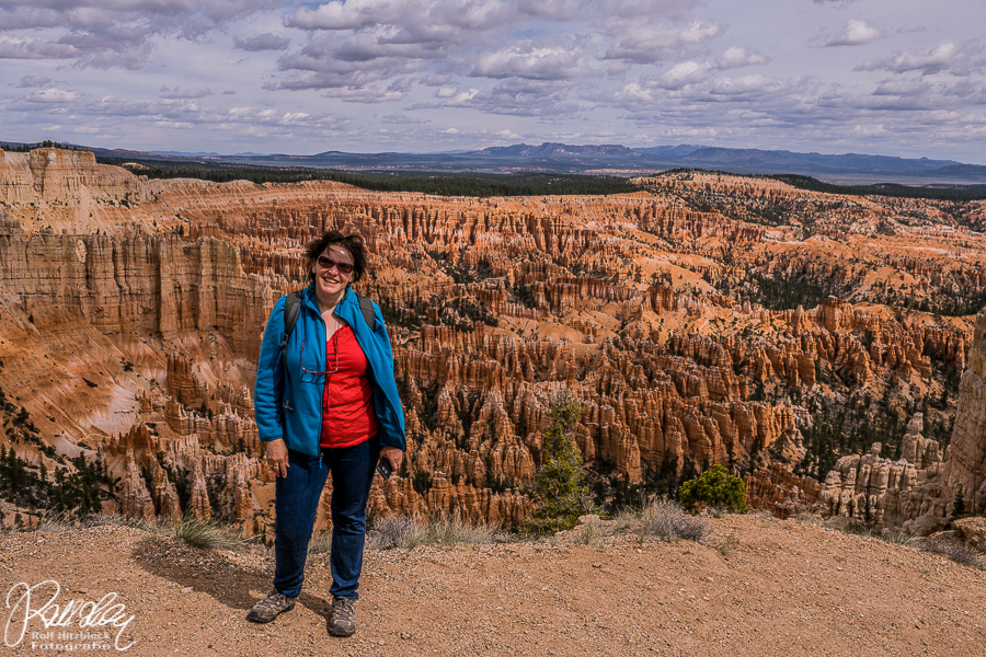 Bevor es auf die Piste geht, können wir uns noch einen letzten Blick in den Canyon gönnen. Da uns zwei Tage vorher der Bryce Point so positiv aufgefallen war, fuhren wir nach dem Auschecken kurzerhand dort hin. Aber auch hier war außergewöhnlich viel los. Es war absolut kein Parkplatz zu bekommen. Ich musste zwei große Runden drehen und wurde immer wieder weggescheucht. Die Damen hatte ich schon rausgelassen, damit sie wenigstens einen der großartigen Blicke erhaschen können.