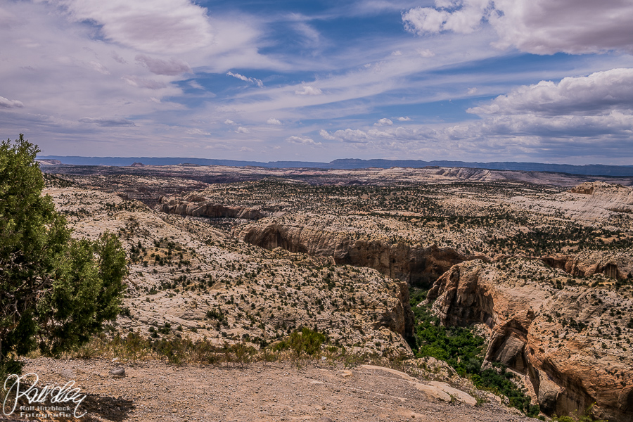 Auch der Blick zu der Stelle, wo die Calf Creek Falls liegen, war möglich. Und mit dem Auto ist es ungleich leichter von oben draufzuschauen, als sich in stundenlanger Arbeit durch den heißen und tiefen Sand dorthin zu kämpfen.