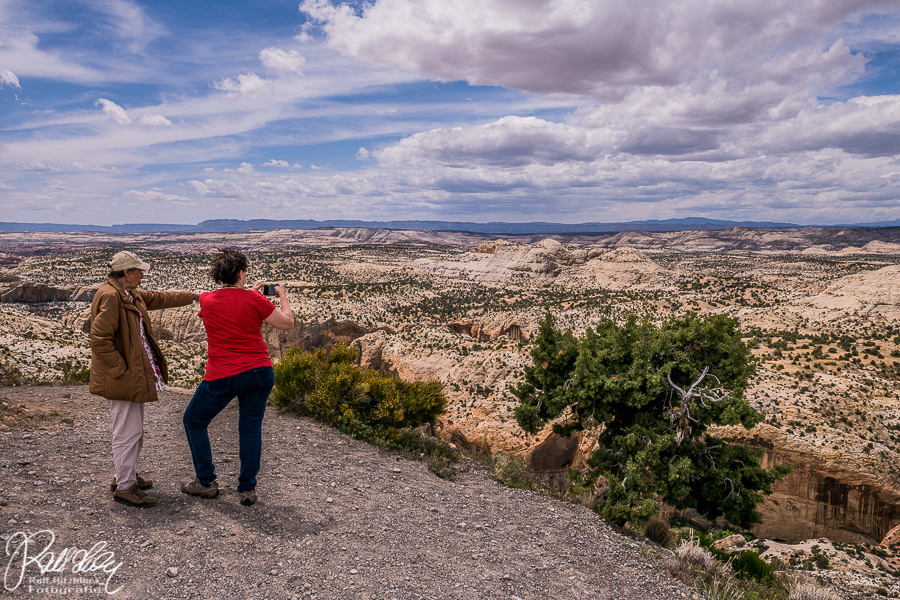 Nun noch kurz tanken und ab in Richtung Escalante. Die Strecke bis zum Escalante River hatten wir ja schon gestern genug bestaunt, so dass es erst danach so richtig interessant wurde. Man fährt ja nach der Calf Creek Recreation Area die weißen Felsen hoch, bis man oben auf der Ridge einen der tollsten Ausblicke auf die Escalante Canyons hat.