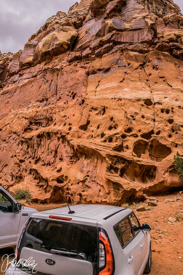 Wir machten nur einen kurzen Abstecher bis zum Grand Wash und wollten dort picknicken, aber auch dort war der Wind so heftig, dass wir nur roten Staub auf dem Futter gehabt hätten.