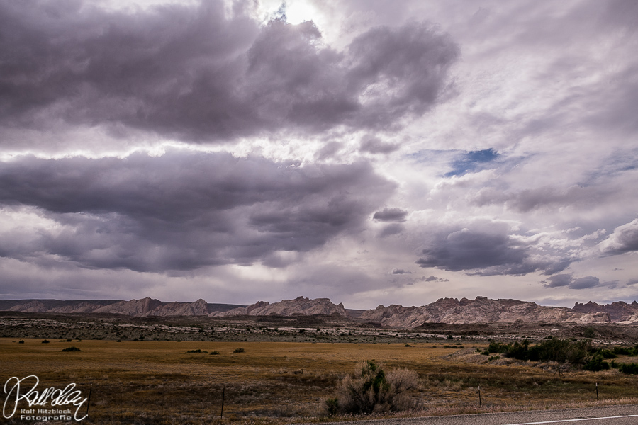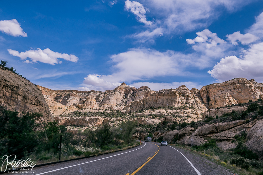 Jetzt geht es auf nach Hanksville. Die Strecke im Nationalpark lässt einen Blick in die weißen Felsen offen, anschließend wird es deutlich langweiliger.