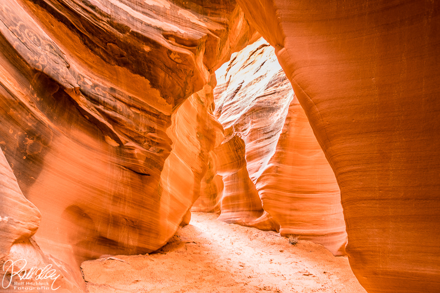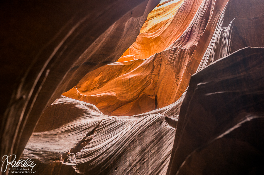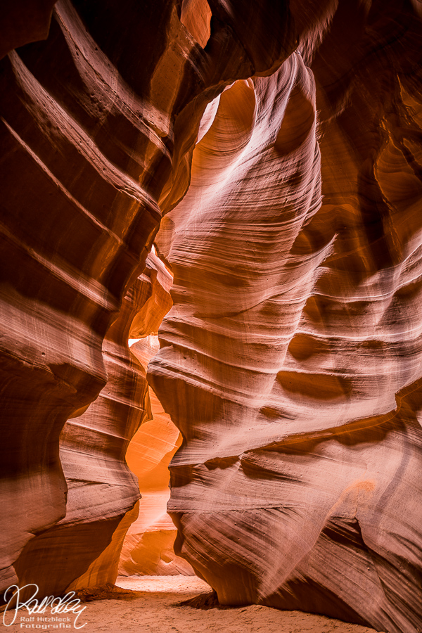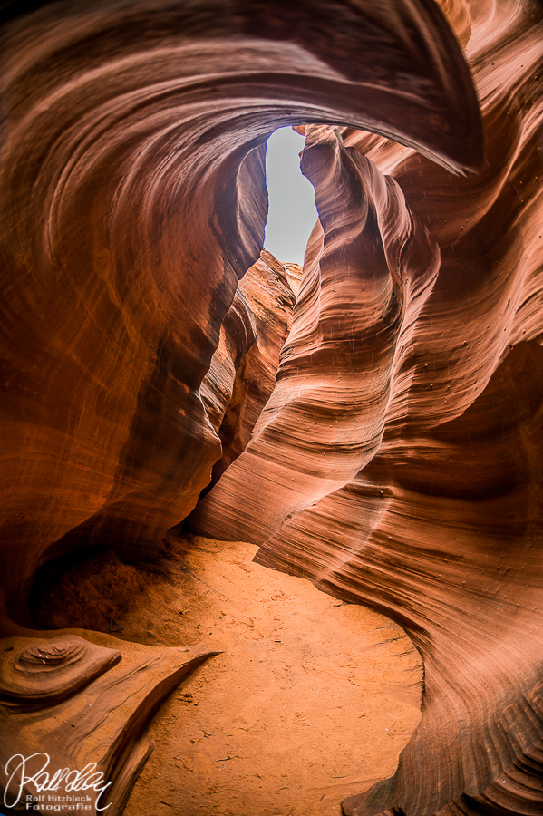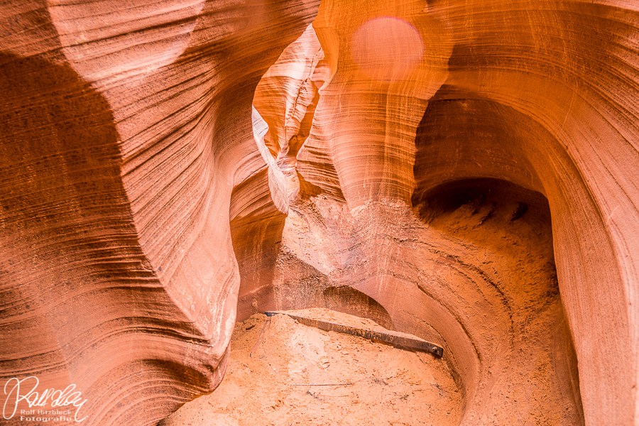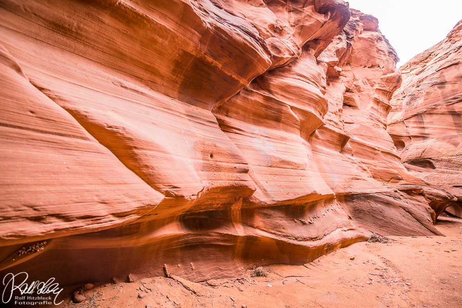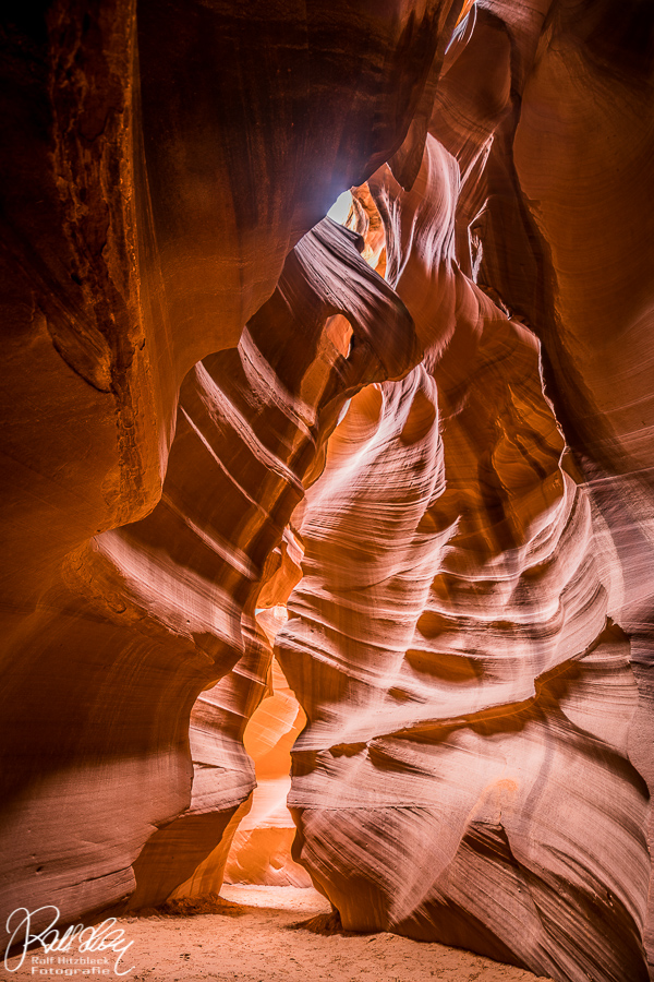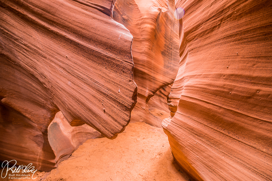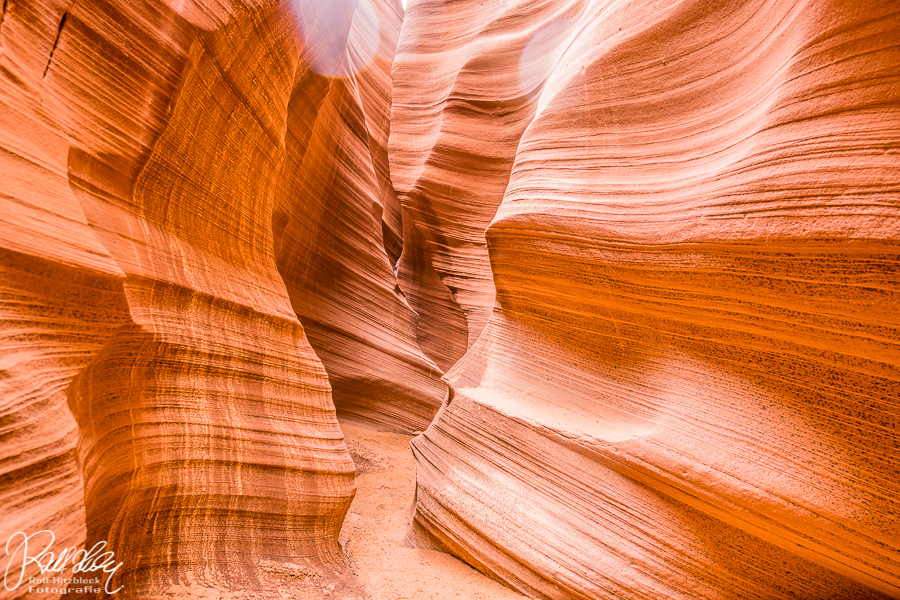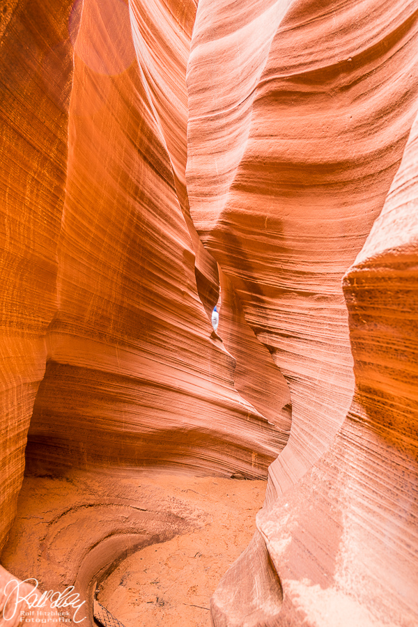 Dann ging es wieder zurück, um sechs weitere Fotobegeisterte abzuholen in den Upper Antelope Canyon. Hier trennte sich die Spreu vom Weizen. Die Mitglieder einer Fototour wurden deutlich besser behandelt als das normale Fußvolk. Aber auch hier war strikte Organisation angesagt: Wer hat extreme Weitwinkel? Du gehörst zu Lower Section, der Rest zur Upper Section. Was bedeutet das nun wieder? Das erfuhren wir am ersten Fotostop. Steven zeichnete mit dem Fuß einen Strich in den Sand und bedeutete der „Lower Section“, mit eingefahrenem Stativ hinzuknieen, damit sich die Upper Section mit ausgefahrenen Stativbeinen hinter uns aufstellen konnte und beide Parteien gleichzeitig knipsen konnten. Für die Zeit von zwei Minuten war der Canyon für uns Fotografen wirklich gesperrt. Kurz vor Ablauf hieß es: 30 Seconds, 15 Seconds und dann marschierten die Fußtruppen wieder durch unser Sichfeld. So ging es hin und her, kreuz und quer.