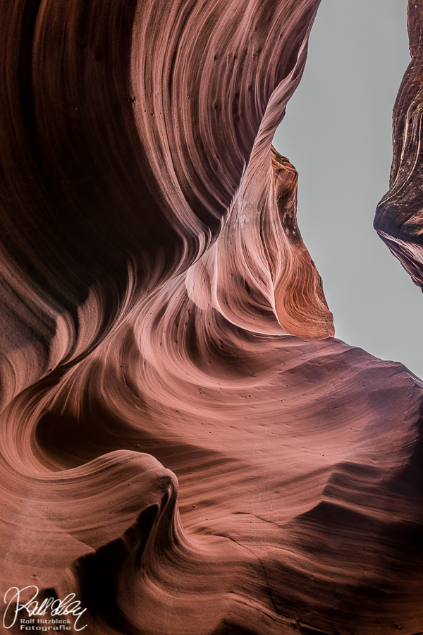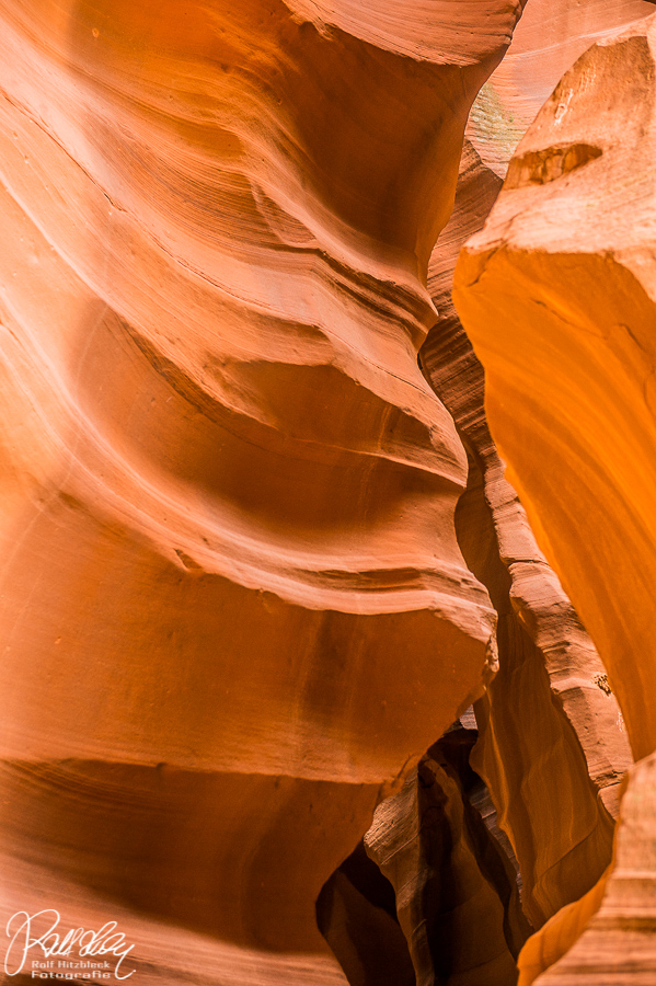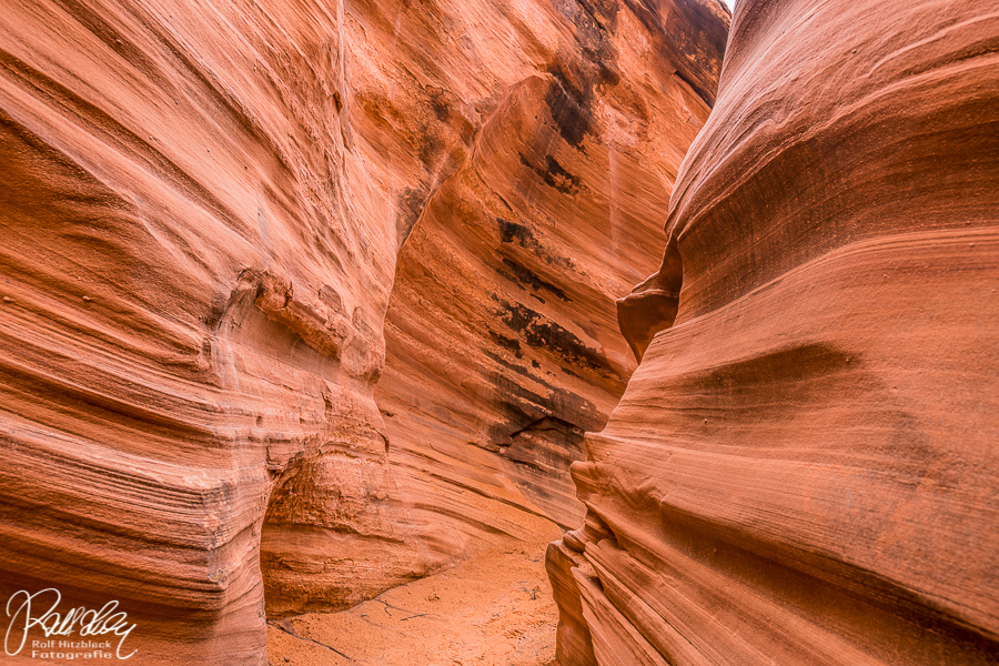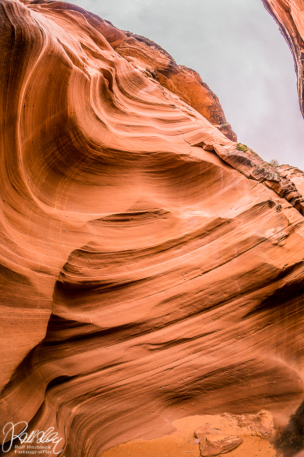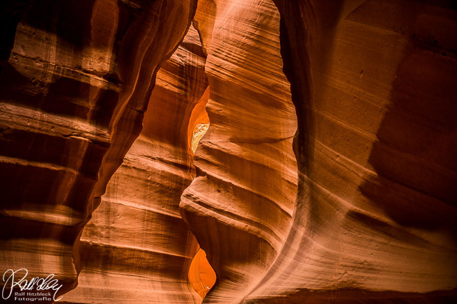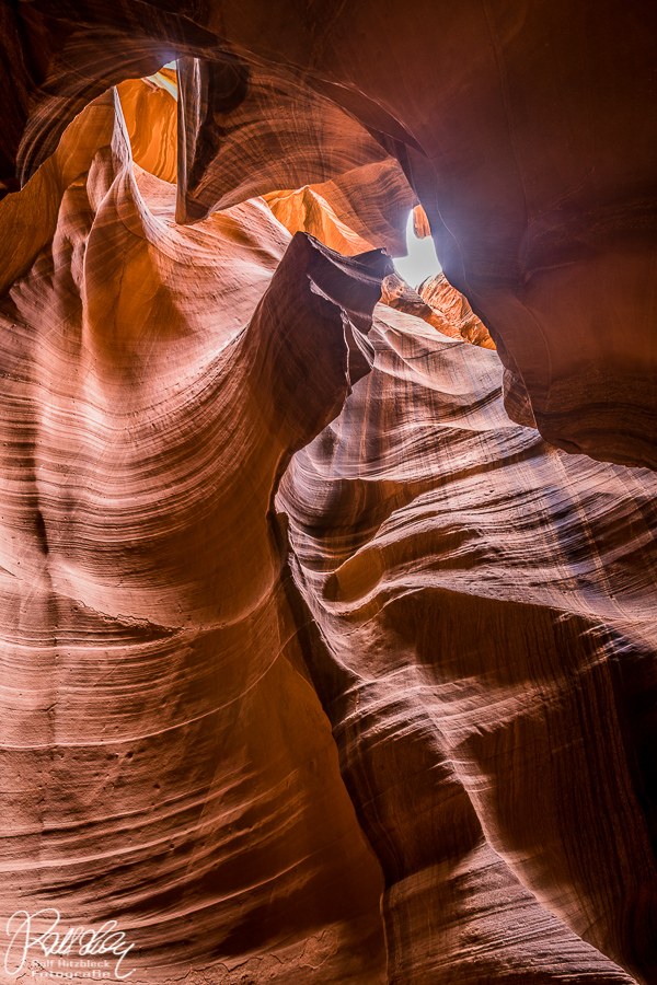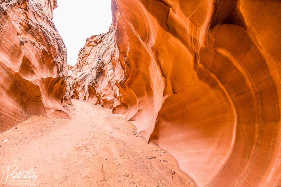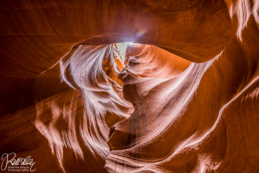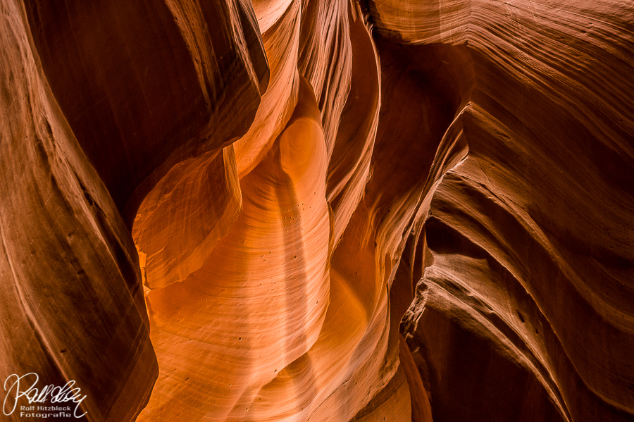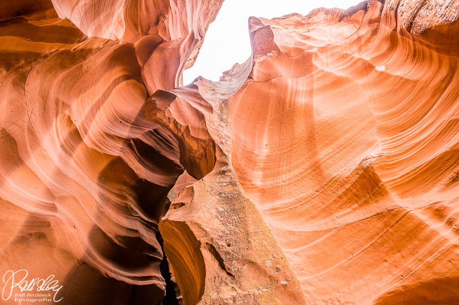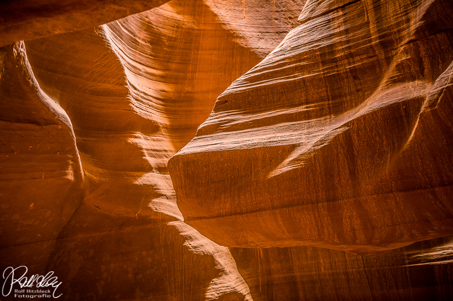 Dann ging es wieder zurück, um sechs weitere Fotobegeisterte abzuholen in den Upper Antelope Canyon. Hier trennte sich die Spreu vom Weizen. Die Mitglieder einer Fototour wurden deutlich besser behandelt als das normale Fußvolk. Aber auch hier war strikte Organisation angesagt: Wer hat extreme Weitwinkel? Du gehörst zu Lower Section, der Rest zur Upper Section. Was bedeutet das nun wieder? Das erfuhren wir am ersten Fotostop. Steven zeichnete mit dem Fuß einen Strich in den Sand und bedeutete der „Lower Section“, mit eingefahrenem Stativ hinzuknieen, damit sich die Upper Section mit ausgefahrenen Stativbeinen hinter uns aufstellen konnte und beide Parteien gleichzeitig knipsen konnten. Für die Zeit von zwei Minuten war der Canyon für uns Fotografen wirklich gesperrt. Kurz vor Ablauf hieß es: 30 Seconds, 15 Seconds und dann marschierten die Fußtruppen wieder durch unser Sichfeld. So ging es hin und her, kreuz und quer.